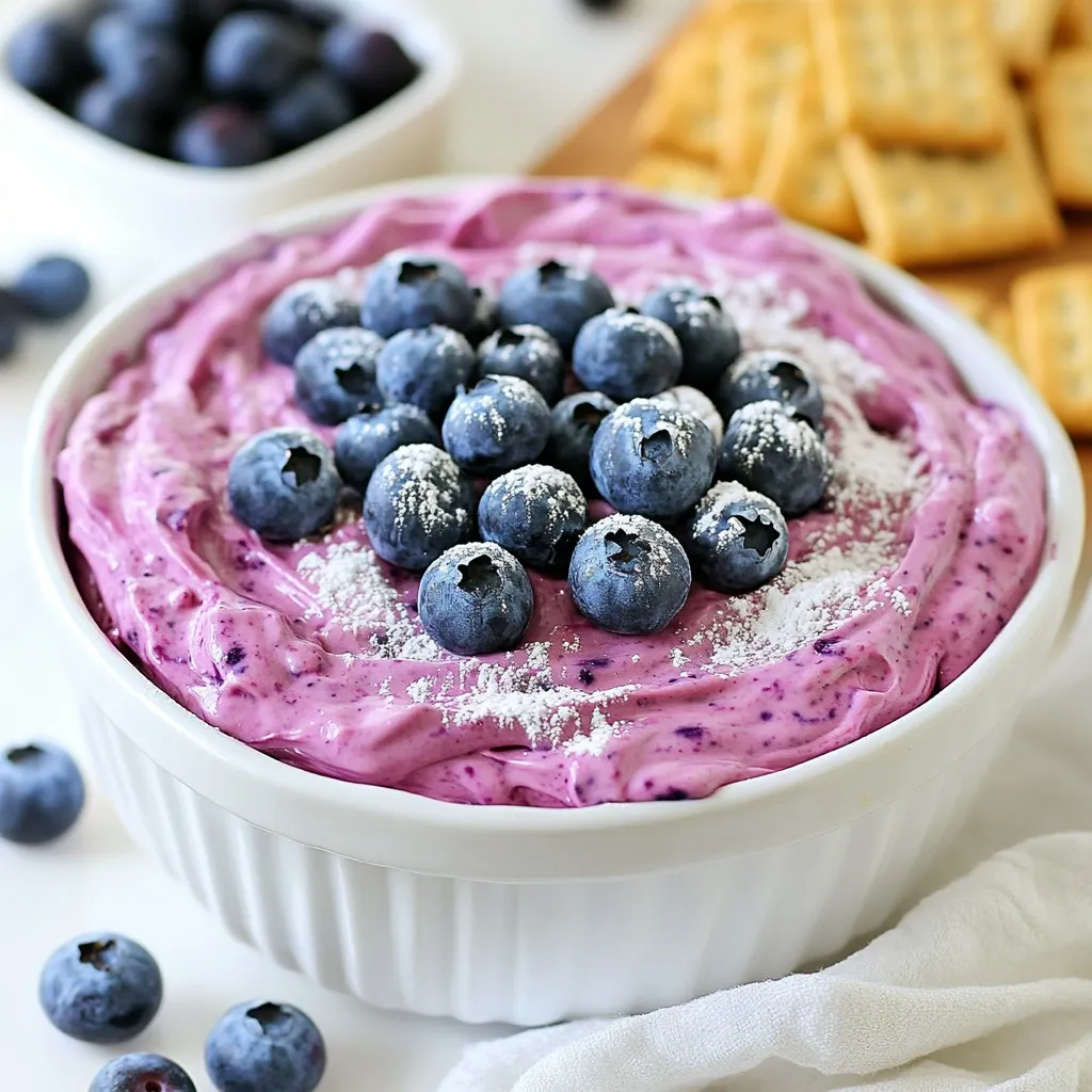 To make this dip, you need key ingredients. Start with 8 oz of cream cheese. It should be softened for easy mixing. Add 1/2 cup of sifted powdered sugar. This keeps the dip smooth and sweet. Don't forget 1 teaspoon of pure vanilla extract. This adds a nice flavor. Next, we need fresh ingredients for taste and color. Use 1 cup of fresh blueberries. They bring a burst of flavor. You can set aside extra blueberries for garnish. You will also need 1/4 cup of freshly squeezed lemon juice. This gives a zesty kick to balance the sweetness. For dipping, I suggest a few tasty options. Graham crackers are classic and crunchy. You can also use assorted fruit slices. Apples and strawberries work great. These will enhance your dip experience. Try different dips to see what you enjoy most! {{ingredient_image_2}} To start, gather your ingredients. You will need cream cheese, powdered sugar, and vanilla extract. First, place the softened cream cheese in a large bowl. Add the sifted powdered sugar and the vanilla extract. Beat these together with an electric mixer on medium speed. Keep mixing until the blend is smooth and creamy without lumps. Next, it's time to add the Greek yogurt. Gradually mix in half a cup of yogurt. This makes the dip extra creamy. Once fully combined, gently fold in one cup of fresh blueberries. Use a spatula to avoid smashing them. Reserve some blueberries for later. Now, drizzle in the freshly squeezed lemon juice. This adds a nice zing! Taste the dip. If you like it sweeter, add a bit more powdered sugar. Now, spoon the blueberry cheesecake dip into a nice serving bowl. Top it with the reserved blueberries for a pretty look. If you want, sprinkle a little powdered sugar on top for extra sweetness. Serve the dip with graham crackers or fresh fruit slices like apples or strawberries. Enjoy every creamy bite! To get a smooth and creamy dip, use softened cream cheese. If it's cold, it will be lumpy. Beat the cream cheese with powdered sugar and vanilla first. Mix until it’s smooth. Then, add Greek yogurt slowly. This keeps the dip light and fluffy. Finally, fold in the blueberries carefully. You want them whole for texture. Taste your dip before serving. If you want it sweeter, add more powdered sugar. Start with a little, then mix well. You can always add more, but you can't take it out. The lemon juice adds a nice zing, balancing the sweetness. It’s all about finding that perfect blend. Make your dip look pretty! Use a nice bowl for serving. Top with fresh blueberries for color. You can also sprinkle some powdered sugar on top. For a fancy touch, serve in small ramekins. Add fresh mint leaves beside each one for a pop of green. It makes the dip look special and inviting! Pro Tips Use Room Temperature Cream Cheese: Ensuring that your cream cheese is at room temperature allows for easier mixing and a smoother texture in your dip. Opt for Fresh Blueberries: Fresh blueberries will provide the best flavor and texture. If using frozen, make sure to thaw and drain them well to avoid excess moisture. Adjust Sweetness to Taste: Depending on the tartness of your blueberries and personal preference, feel free to adjust the amount of powdered sugar to achieve your desired sweetness level. Chill Before Serving: For an even creamier dip, refrigerate the mixture for at least 30 minutes before serving. This allows the flavors to meld beautifully. {{image_4}} You can make your blueberry cheesecake dip even better. Adding lemon zest brightens the flavor. It gives your dip a fresh and tangy taste. You can also use flavored yogurt. Try vanilla or lemon yogurt for a twist. This small change adds a layer of flavor that excites your taste buds. Blueberries are great, but you can mix it up. Try raspberries or strawberries for a fruity flair. These berries will add a nice color and taste. You can also use peaches or mangoes for a tropical vibe. Each fruit brings its own twist, making your dip unique. Graham crackers are a classic, but there are more options. Serve with apple slices for a crisp and sweet crunch. You can also use strawberries for a berry-on-berry treat. Try pretzels for a salty contrast to the sweet dip. Each dipping partner can change your experience, making every bite a little surprise. To keep your blueberry cheesecake dip fresh, store it in an airtight container. This helps prevent it from drying out or absorbing odors from your fridge. Always refrigerate the dip right after serving. If you have leftovers, don't let them sit out for too long. This dip lasts about 3 to 5 days in the fridge. If you want to freeze it, use a freezer-safe container. It can stay good for about one month frozen. When you are ready to use it, defrost it in the fridge overnight. After thawing, stir it well. The texture might change slightly, so taste it again and adjust the sweetness if needed. You can make the dip a day before your event. This can save you time and stress. Just follow the recipe and store it in the fridge. The flavors will blend and taste even better the next day. Remember to garnish it right before serving. This will keep it looking fresh and inviting. Yes, you can use frozen blueberries. They work well in the dip. Just thaw them first. This helps reduce excess moisture. Be careful when mixing, as they can break apart. If you want a fresher taste, use fresh blueberries. They add a nice crunch and vibrant color. If you don’t have Greek yogurt, try sour cream. It gives a similar tangy flavor. You can also use regular yogurt, but the dip may be thinner. Cream cheese alone can work too, but it lacks some creaminess. Remember to taste and adjust the sweetness if you change the yogurt. You can keep leftover dip in the fridge for about three days. Make sure to store it in an airtight container. This keeps it fresh and tasty. If you notice any change in color or smell, it’s best to discard it. For a quick snack, enjoy it with fresh fruit or graham crackers! You can make a tasty blueberry chee