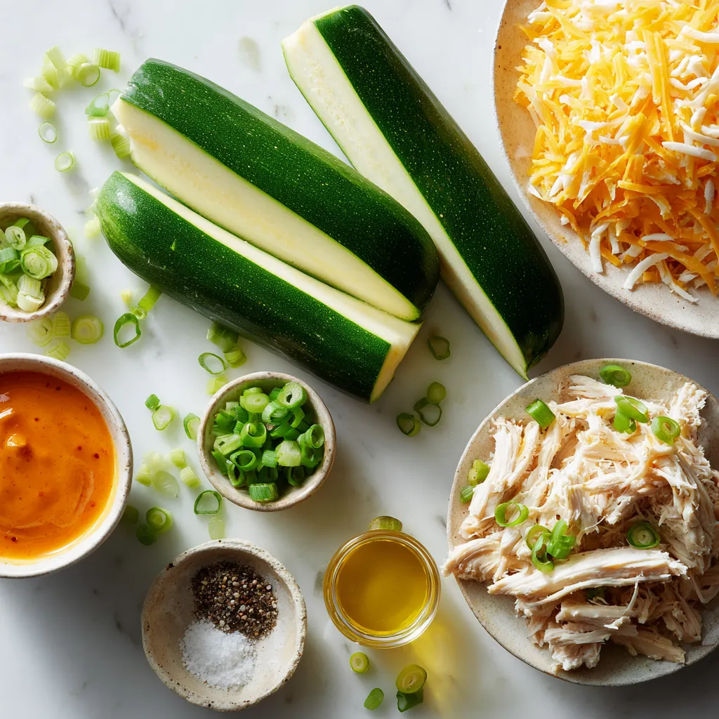 While the zucchinis are baking, prepare the buffalo chicken filling. In a mixing bowl, combine the shredded chicken, buffalo sauce, softened cream cheese, half of the shredded cheddar cheese, and the chopped green onions. Stir until all the ingredients are thoroughly mixed and well combined.