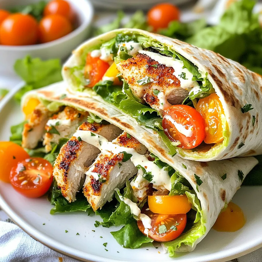 For the best Cajun Chicken Caesar Wraps, gather these simple ingredients: - 2 boneless, skinless chicken breasts - 2 tablespoons Cajun seasoning - 1 tablespoon olive oil - 4 large tortillas (whole wheat or flour) - 1 cup romaine lettuce, finely chopped - ½ cup cherry tomatoes, halved - ½ cup Caesar dressing (store-bought or homemade) - ¼ cup freshly grated Parmesan cheese - Salt and freshly ground pepper to taste - Fresh parsley for garnish (optional) These ingredients come together to create a tasty meal that is easy to prepare. The Cajun seasoning gives the chicken a spicy kick. Fresh romaine lettuce and cherry tomatoes add crunch and color. You can choose whole wheat or flour tortillas based on your preference. The Caesar dressing and Parmesan cheese bring in creamy and cheesy elements. This makes every bite a delight. If you want to add a pop of color, use fresh parsley as a garnish. Gathering these items is the first step to enjoying a flavorful meal. The ingredients are common and easy to find. They ensure your wraps are not just filling but also packed with flavor. {{ingredient_image_2}} Start by patting the chicken breasts dry with paper towels. This helps the seasoning stick. Next, rub the chicken with olive oil. Use enough to coat both sides. Then, sprinkle Cajun seasoning on the chicken. Make sure to cover it well for full flavor. Finally, add a pinch of salt and ground pepper. Heat a large skillet over medium heat. Wait until it’s hot before adding the chicken. Cook each breast for about 6-7 minutes on one side. Flip it over and cook for the same time on the other side. The chicken is done when it is no longer pink inside. Check that the internal temperature reaches 165°F (75°C). Once cooked, move the chicken to a cutting board to rest for a few minutes. After resting, slice the chicken into thin strips. Aim for bite-sized pieces to fit nicely in your wrap. Slicing helps keep the chicken juicy and flavorful. Lay out the tortillas on a clean surface. Start with a layer of chopped romaine lettuce in the center. Then, add half of the halved cherry tomatoes. Next, place the sliced Cajun chicken on top. Drizzle Caesar dressing over everything. Finish by sprinkling freshly grated Parmesan cheese on top. To wrap the tortillas, first fold in the sides. This keeps the filling from spilling out. Then, roll the tortilla tightly from the bottom up. Make sure it’s fully wrapped. Repeat this for the other tortillas. Cut each wrap in half diagonally for easy eating. Place the wraps on a serving platter. You can drizzle extra Caesar dressing on top for added flavor. If you like, add fresh parsley as a garnish. This makes the dish look nice and colorful. To cook chicken that is juicy and flavorful, start with dry chicken breasts. Pat them with paper towels first. Then, rub them with olive oil and Cajun seasoning. This helps the spices stick. Heat your skillet on medium heat before adding the chicken. Cook for 6-7 minutes on each side. You want the inside to reach 165°F. Let the chicken rest for a few minutes after cooking. This keeps it moist. Marinades can really boost the taste of your chicken. You can mix olive oil, lemon juice, and Cajun seasoning for a simple marinade. Let the chicken sit in it for at least 30 minutes. This adds depth to the flavor. If you have more time, marinate it overnight. The longer you marinate, the better the taste. Choosing the right tortilla can change your wrap game. Flour tortillas are soft and chewy, great for holding fillings. Whole wheat tortillas add fiber and a nutty taste. You can also try spinach or tomato tortillas for color. Each type adds a unique touch to your Cajun chicken Caesar wraps. Pro Tips Resting the Chicken: Allowing the chicken to rest for a few minutes after cooking helps retain its juices, making it more tender and flavorful when sliced. Cajun Spice Level: Adjust the amount of Cajun seasoning according to your spice preference. For a milder flavor, use less seasoning or choose a milder blend. <strong.Wrap Variations: Feel free to add other ingredients such as avocado, bell peppers, or cucumbers for extra crunch and flavor in your wraps. <strong.Storing Leftovers: If you have leftover wraps, store them in an airtight container in the refrigerator. Enjoy them within 2 days for the best taste and freshness. {{image_4}} You can easily switch the chicken for other proteins. Try shrimp, beef, or tofu. Each option brings unique flavors. For shrimp, season them with Cajun spice and cook until pink. For beef, use thin slices of steak, cooked to your liking. Tofu is a great choice for a meat-free meal. Just press it to remove water, then cube and season. Each protein change keeps the wrap exciting. To make this wrap vegetarian, skip the chicken. Instead, try grilled vegetables like zucchini, bell peppers, or eggplant. You can also use chickpeas for protein. Toss them with Cajun seasoning and roast for flavor. For a creamy touch, add avocado slices or hummus inside the wrap. This way, you keep the taste but make it plant-based. Feel free to load up on more veggies in your wrap. Carrots, cucumbers, and bell peppers add crunch and color. You can even toss in some spinach for extra greens. Adding vegetables boosts the nutrition in your meal. Plus, it makes your wraps more fun and colorful. Mix and match your favorite veggies to find the best combo! To keep your Cajun chicken Caesar wraps fresh, wrap them tightly in foil or plastic wrap. Place them in an airtight container if you prefer. Store leftovers in the fridge for up to three days. Make sure to eat them cold or reheat them before enjoying. You can freeze these wraps for later. To do this, wrap each one in foil or plastic wrap. Then, place the wrapped wraps in a freezer bag. They will stay good for about two months. When you are ready to eat them, move them to the fridge overnight to thaw. To reheat, unwrap the wrap and place it on a plate. Microwave for one to two minutes or until hot