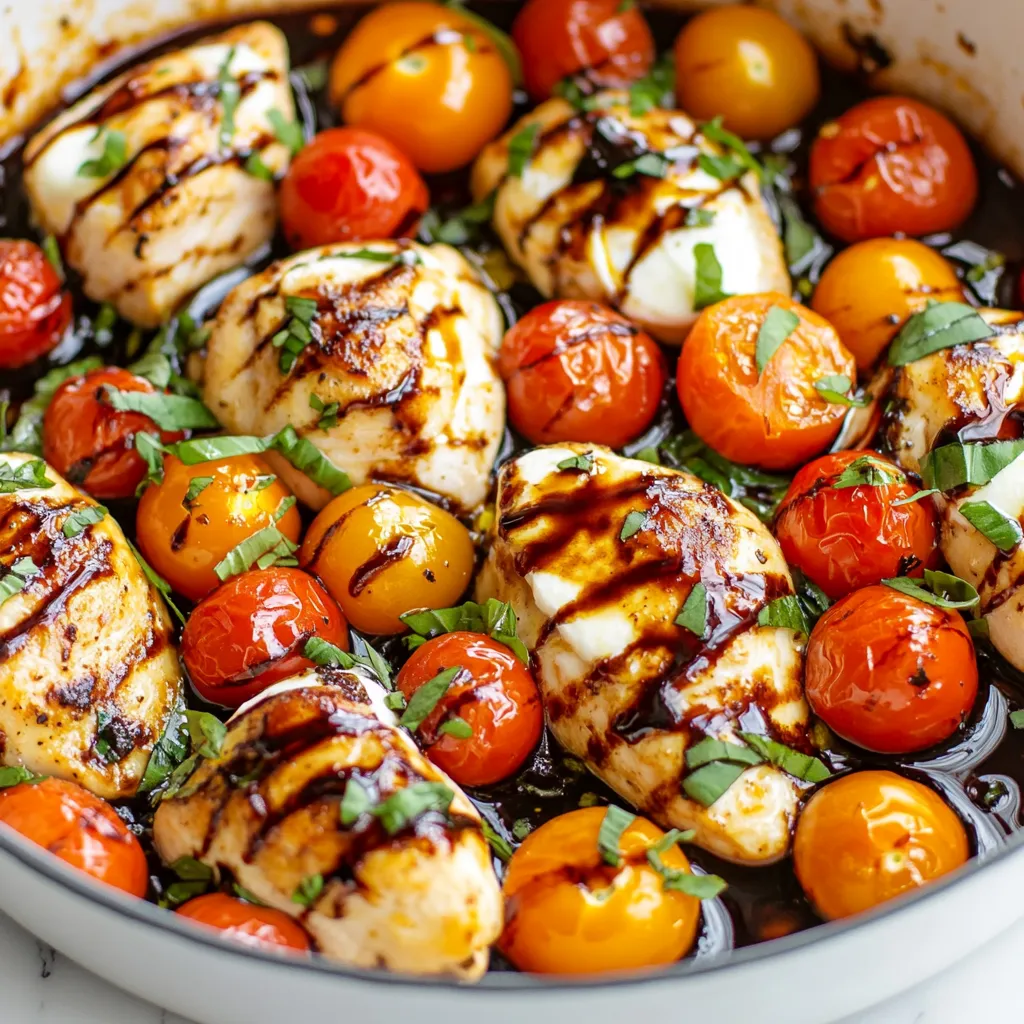 A delicious and colorful one-pan dish featuring chicken breasts, cherry tomatoes, fresh mozzarella, and basil, all drizzled with balsamic glaze.