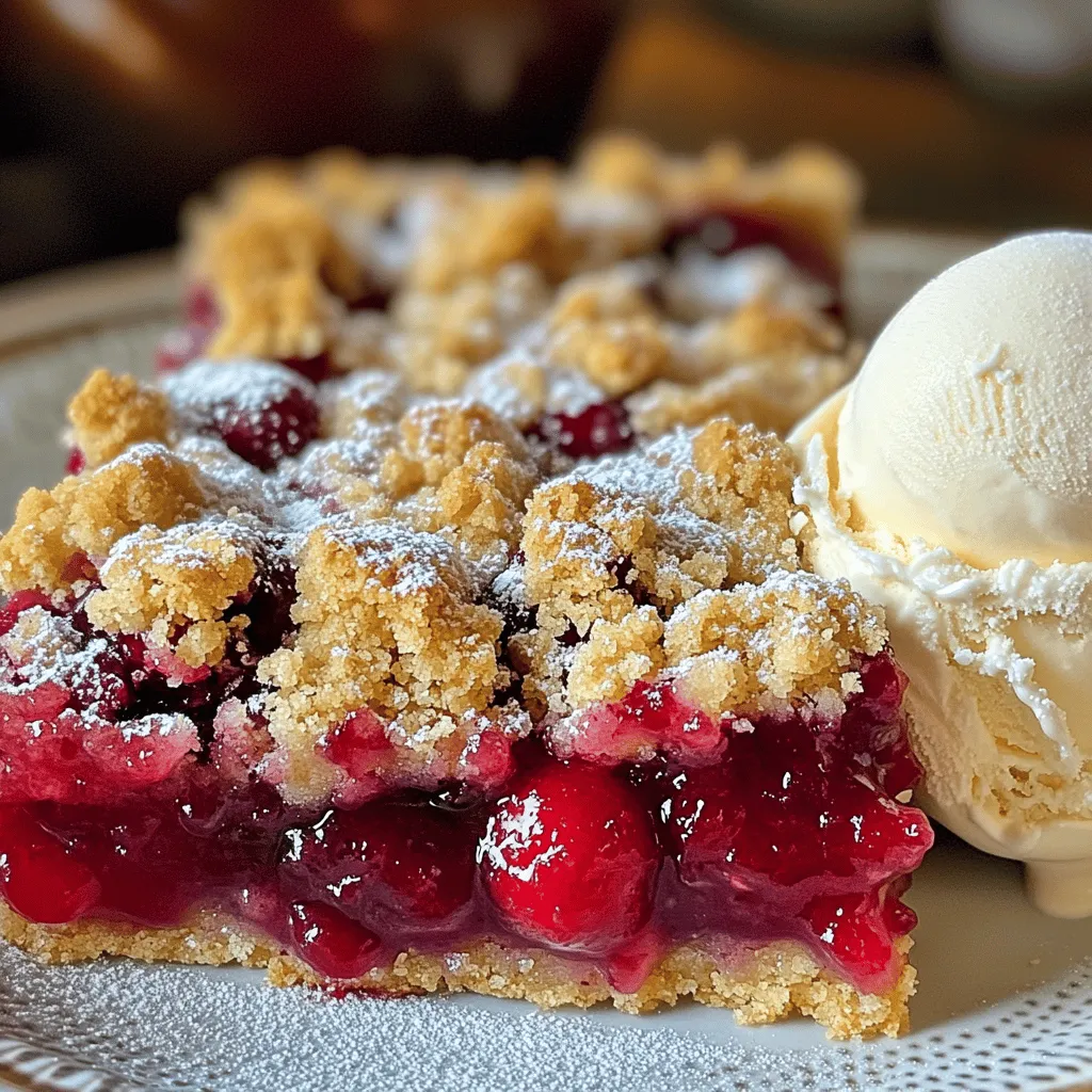 Serve the cherry pie crumble bars warm or at room temperature. A light dusting of powdered sugar adds a nice touch. For a special treat, add a scoop of vanilla ice cream on top. The creaminess pairs perfectly with the tart cherries. You can also serve them with whipped cream for extra sweetness.