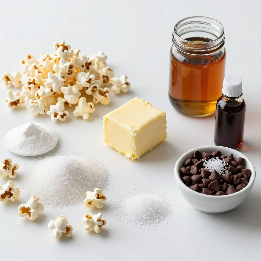 I love making this chocolate caramel popcorn. It starts with the main ingredients: popped popcorn kernels, granulated sugar, and unsalted butter. These create the base for our sweet treat.