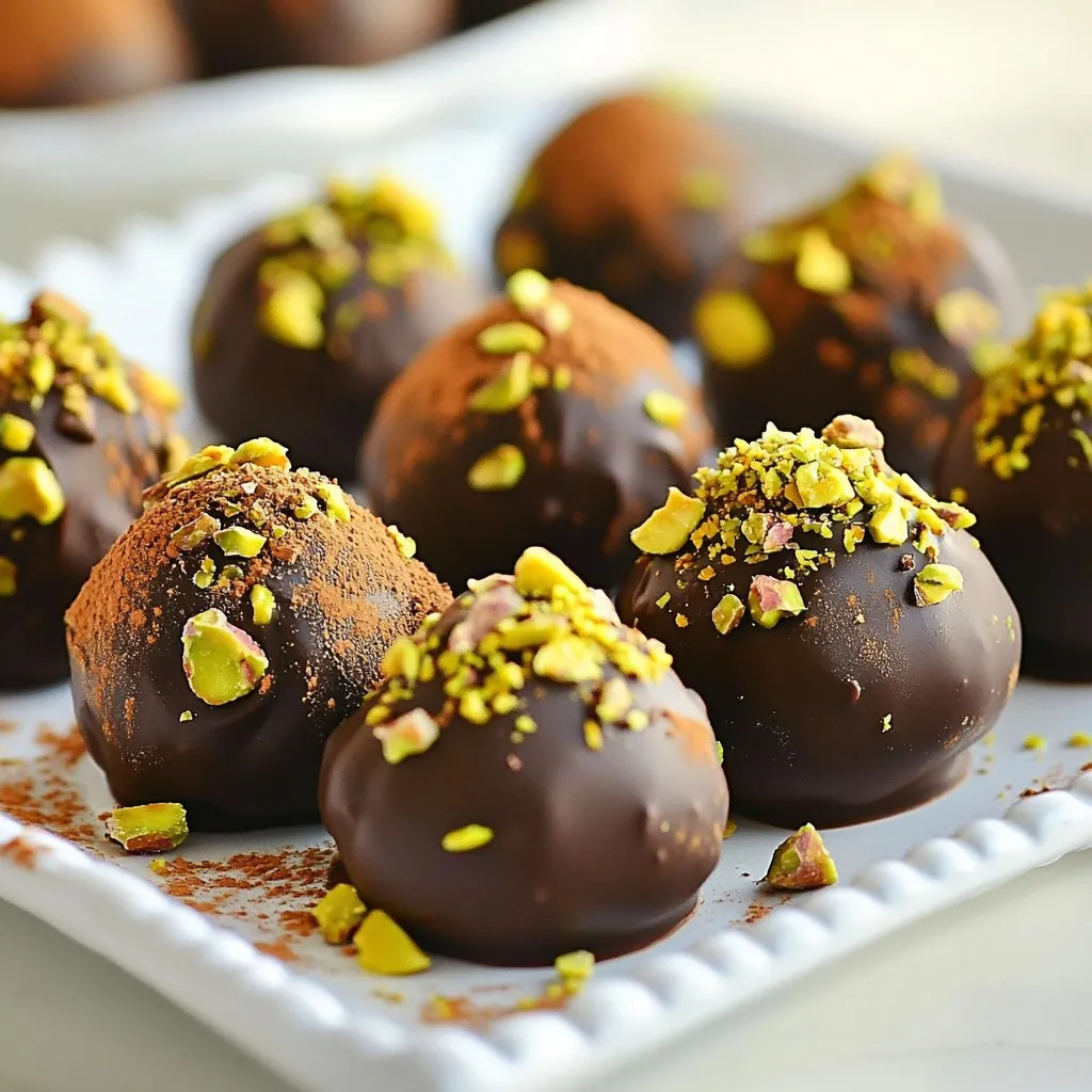 For an indulgent finish, roll half of the truffles in the unsweetened cocoa powder. For the remaining truffles, roll them in finely chopped pistachios or crushed almonds, introducing a delightful crunch and flavor contrast.