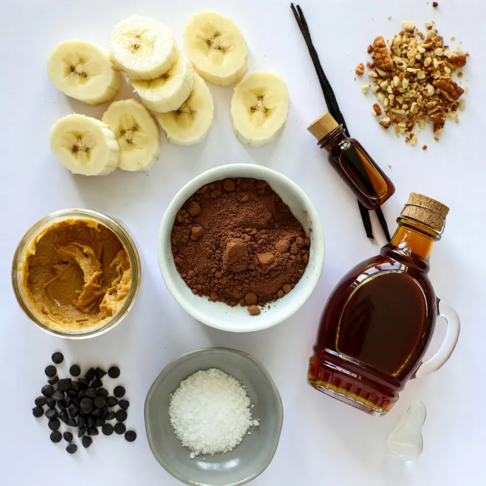 To make this nice cream, start with ripe bananas. They should be sweet and soft. Use natural peanut butter; it gives a rich taste. Unsweetened cocoa powder adds deep chocolate flavor. If you like it sweeter, add maple syrup. Just a teaspoon of vanilla extract enhances all the flavors. Finally, a pinch of salt balances the taste.