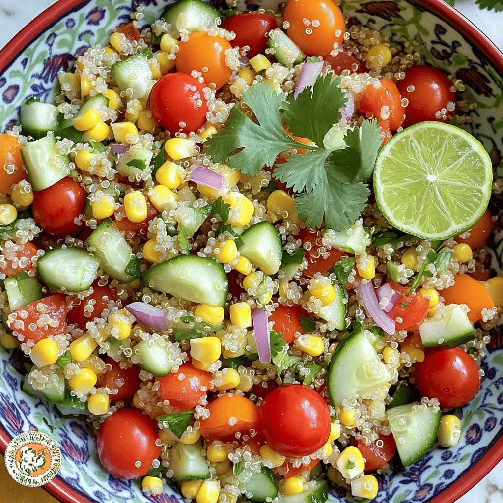 The star of this salad is quinoa. It is a gluten-free grain packed with protein. Coconut water adds a sweet, tropical flair. Fresh veggies like cherry tomatoes, cucumbers, and bell peppers give color and crunch. Corn brings a lovely sweetness, while red onion adds a nice bite. Don’t forget the cilantro; it gives a fresh taste.