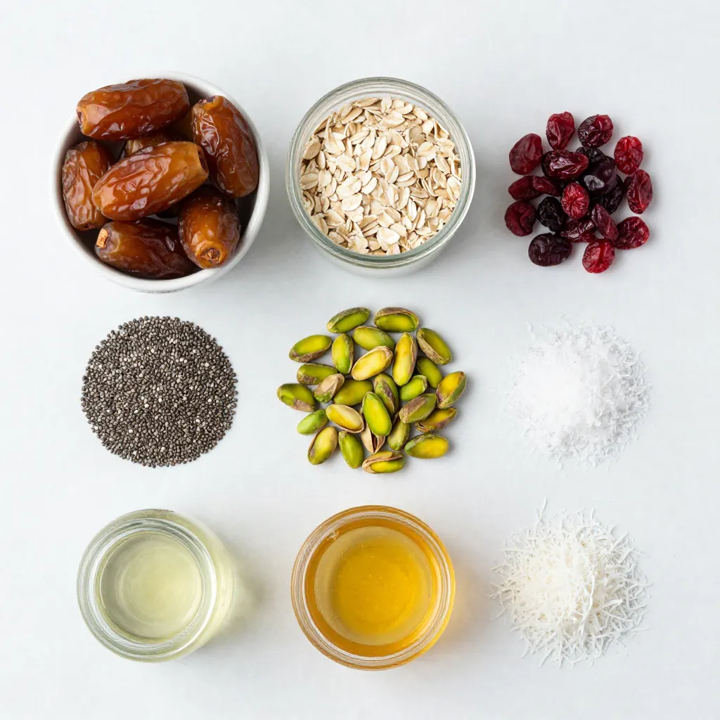 These key ingredients make up the base of your energy bites. Medjool dates provide natural sweetness and a chewy texture. Rolled oats add fiber and help bind the mixture. Pistachios give a nice crunch. Dried cranberries add tartness and color. Chia seeds are great for extra nutrients. Honey or maple syrup sweetens the mix, while sea salt enhances all the flavors.