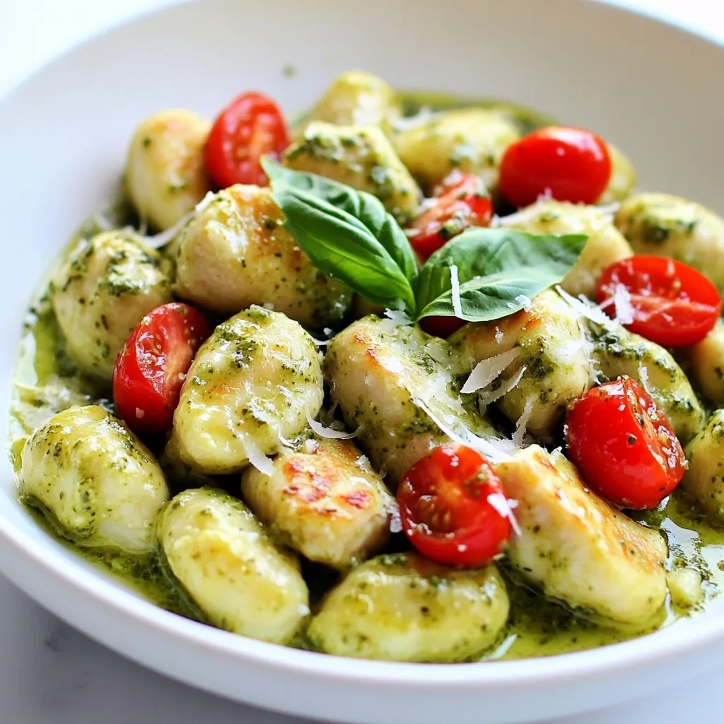 A delightful creamy dish featuring chicken, gnocchi, and basil pesto.