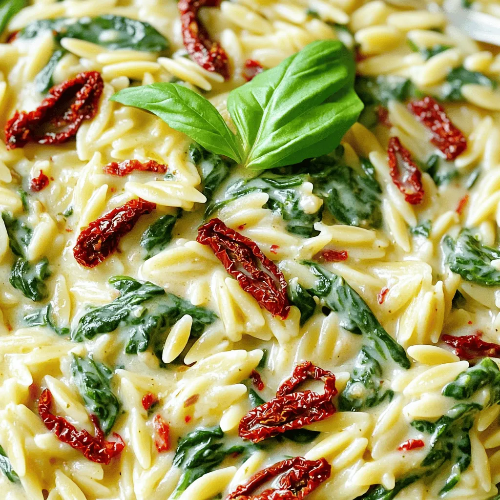 To make creamy spinach sun-dried tomato orzo, start by gathering your ingredients. You will need orzo pasta, vegetable broth, fresh spinach, sun-dried tomatoes, heavy cream, Parmesan cheese, garlic, onion, olive oil, salt, and pepper. This dish takes about 30 minutes to prepare and serves four people.