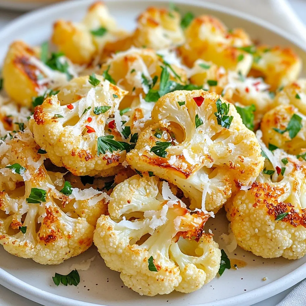 A delicious and healthy side dish featuring roasted cauliflower tossed in garlic, olive oil, and topped with Parmesan cheese.