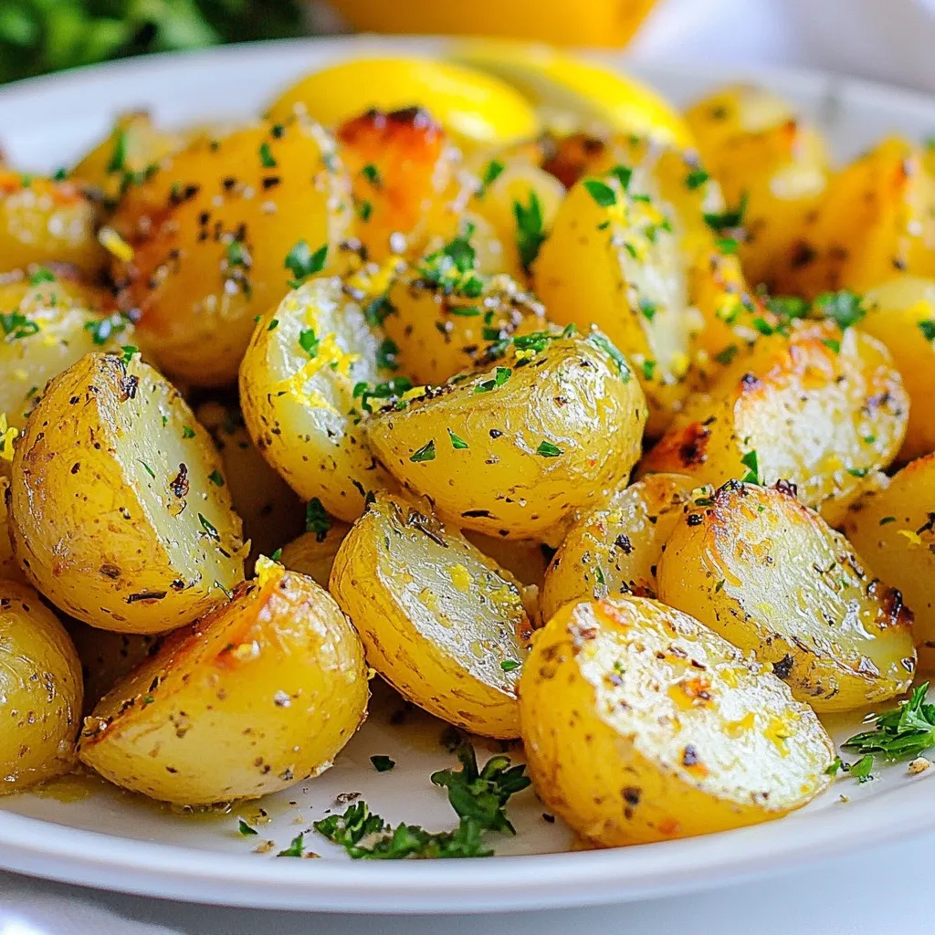 A vibrant and flavorful dish featuring roasted baby Yukon gold potatoes marinated in a zesty lemon-garlic mixture.