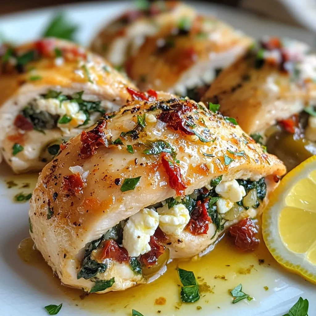 To make Greek stuffed chicken breast, you need simple and fresh ingredients. Here’s a list to help you gather everything: - 4 boneless, skinless chicken breasts - Filling ingredients: - 1 cup fresh spinach, finely chopped - 1 cup feta cheese, crumbled - 1/2 cup sun-dried tomatoes, roughly chopped - 1/4 cup Kalamata olives, pitted and coarsely chopped - 2 cloves garlic, finely minced - 1 teaspoon dried oregano - 1 tablespoon extra virgin olive oil - Seasoning ingredients: - Sea salt and freshly ground black pepper, to taste - Cooking tools: - Toothpicks or kitchen twine These ingredients create a burst of flavor. The mix of spinach, feta, and olives adds a unique taste. This filling is hearty and satisfying. Make sure to use fresh spinach and high-quality feta for the best flavor. The Kalamata olives give a nice briny kick. Don't forget the garlic and oregano; they bring out the Mediterranean essence. Gather these items, and you’ll be ready to create a delicious meal. {{ingredient_image_2}} 1. Preheat your oven to 375°F (190°C). This helps the chicken cook evenly. 2. In a medium bowl, mix the filling. Combine the chopped spinach, feta cheese, sun-dried tomatoes, Kalamata olives, minced garlic, dried oregano, and olive oil. Add sea salt and black pepper to taste. Stir well until everything blends nicely. 1. Place the chicken breasts on a cutting board. Use a sharp knife to cut a pocket into each breast. Be careful not to cut all the way through. The pocket needs to be deep enough for the filling. 2. Stuff each chicken breast with the filling. Make sure to pack it in well for great flavor. Use toothpicks or kitchen twine to secure the openings. This keeps the filling inside while cooking. 1. Heat a drizzle of olive oil in an oven-safe skillet over medium heat. When hot, add the stuffed chicken breasts. Sear them for 4–5 minutes on each side. Look for a golden-brown crust to form. 2. After searing, transfer the skillet to the preheated oven. Bake for 20–25 minutes. The chicken should reach an internal temperature of 165°F (75°C) to be safe to eat. 3. Once done, take the skillet out of the oven. Let the chicken rest for a few minutes. This helps keep it juicy. Remove the toothpicks or twine before serving. 4. For a beautiful presentation, slice each stuffed chicken breast in half. Show off the colorful filling inside! To keep your chicken juicy, don’t skip the resting step. After baking, let it rest for a few minutes. This helps the juices stay inside. Use a meat thermometer to check the chicken’s internal temperature. The safe temp is 165°F (75°C). This ensures your chicken is cooked but not dry. For the best sides, serve Greek stuffed chicken with lemon-herb quinoa or roasted veggies. These pair well and add color to your plate. To garnish, sprinkle freshly chopped parsley on top. Add a lemon wedge for a fresh and bright touch. It makes your dish look inviting and tasty! Pro Tips Use Fresh Ingredients: Whenever possible, opt for fresh spinach and high-quality feta cheese to enhance the flavor of your dish. Fresh ingredients provide a vibrant taste that dried alternatives can't match. Experiment with Fillings: While the Mediterranean filling is delicious, feel free to try different combinations, such as sun-dried tomatoes with basil or goat cheese, for a unique twist on this classic recipe. Let Chicken Rest: After baking, allow the chicken to rest for a few minutes. This step is crucial for retaining juices, ensuring your chicken remains moist and flavorful when you slice into it. Perfectly Secure: Use toothpicks or kitchen twine to securely close the chicken pockets. This prevents the filling from leaking out during cooking, allowing you to enjoy every bite of the delicious stuffing. {{image_4}} You can easily change some ingredients to fit your taste. For cheese, consider using goat cheese instead of feta. Goat cheese adds a creamy texture and a tangy flavor that pairs well with the other ingredients. For greens, try using kale or arugula. Both options will add a different taste and texture. Kale brings a hearty crunch while arugula offers a peppery bite. Feel free to mix these into your stuffing based on what you have or what you like. You don't have to bake this chicken if you want a different flavor. Grilling is a fun way to cook it. Just make sure to preheat your grill. Grill the stuffed chicken for about 6–7 minutes on each side. This will give a nice smoky flavor and keep the chicken juicy. Another option is using a slow cooker. This method is great for meal prep. Stuff the chicken, place it in the slow cooker, and let it cook on low for about 4 hours. The slow cooker will keep all the flavors locked in and make the chicken super tender. To keep your leftover Greek stuffed chicken fresh, use proper storage containers. A good option is a tight-sealing glass or plastic container. This helps prevent moisture loss. Store the chicken in the refrigerator. Your leftovers will last for about 3 to 4 days. If you want to keep them longer, consider freezing. To freeze stuffed chicken, wrap each piece tightly in plastic wrap. This helps protect it from freezer burn. Then, place the wrapped chicken in a freezer-safe bag. You can keep the chicken in the freezer for up to 3 months. When you're ready to eat, thaw the chicken in the refrigerator overnight. For reheating, bake it at 350°F (175°C) until heated through. Enjoy your delicious meal without waste! How do I know when the chicken is done? The chicken is done when it reaches 165°F (75°C). Use a meat thermometer to check the thickest part. This ensures the chicken is safe to eat. The meat will also look white and the juices should run clear. Can I prepare the chicken in advance? Yes, you can prepare the chicken ahead of time. Stuff it and secure it with toothpicks. Then, cover and store it in the fridge for up to a day before cooking. This saves time on busy nights. Is this recipe gluten-free? Yes, this recipe is gluten-