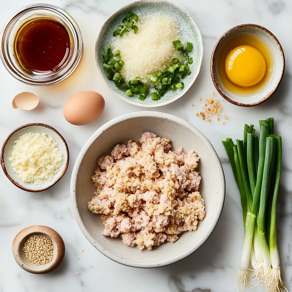 – In a large bowl, combine ground chicken, breadcrumbs, Parmesan, beaten egg, minced garlic, soy sauce, onion powder, garlic powder, salt, and pepper.