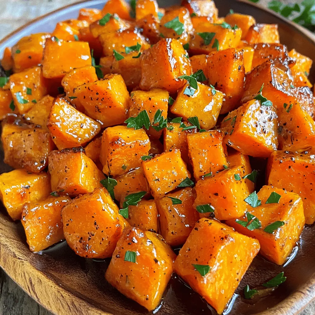 . - Preheat oven to 400°F (200°C). - In a large bowl, mix olive oil, honey, and minced garlic. Add smoked paprika, salt, and black pepper. Whisk until smooth. - Toss the sweet potatoes in the honey garlic mixture. Make sure each piece is well coated. - Line a baking sheet with parchment paper. Spread the sweet potatoes in a single layer on the sheet. This helps them roast evenly. - Place the baking sheet in the oven. Roast for 25-30 minutes. Stir halfway through for even cooking. The sweet potatoes should be tender and caramelized. - After roasting, let the sweet potatoes cool for 5 minutes. This helps the flavors deepen. - Transfer them to a serving dish. Garnish with fresh parsley for a pop of color. For a special touch, drizzle any leftover honey garlic mixture over the top. This adds extra flavor and makes the dish look great. For the complete recipe, check out the Full Recipe. To get that perfect caramelization, follow these steps: - Cut sweet potatoes evenly. This helps them cook at the same rate. - Coat them well in the honey garlic mixture. This adds flavor and aids caramelization. - Spread them out on the baking sheet. Give them space to breathe. Tossing halfway through cooking is key. This ensures even cooking and nice browning on all sides. When you stir, you mix the flavors and help them roast better. If you run out of honey, use maple syrup or agave nectar. Both provide sweetness with a unique flavor twist. For a vegan option, substitute honey with maple syrup. This keeps the recipe vegan while still being delicious. Add spices to boost the flavor. Try cayenne pepper for heat or cinnamon for warmth. You can also mix in ginger for a fresh kick. Using fresh herbs can elevate the dish. Add rosemary or thyme before roasting. This imparts a lovely aroma and deepens the taste. You can sprinkle fresh herbs on top after cooking for a bright finish. For the full recipe, check the details above. Enjoy your cooking adventure! {{image_4}} You can switch sweet potatoes for other veggies. Butternut squash works well too. They have a similar sweetness and texture. You can also add spices for more flavor. Try cinnamon for warmth or cayenne for heat. Honey garlic roasted sweet potatoes pair great with many dishes. They go well with grilled chicken or fish. You can also serve them with a fresh green salad. For sauces, a tangy yogurt sauce adds creaminess. A drizzle of balsamic glaze enhances the sweetness. Using seasonal veggies can add a fun twist. In fall, try adding Brussels sprouts. In summer, mix in zucchini or bell peppers. For holidays, add a sprinkle of cinnamon and nutmeg. This adds a festive touch and warms the heart. For the full recipe, check out the details above. To store leftovers, place the sweet potatoes in an airtight container. This keeps them fresh and tasty. They will last about 3 to 5 days in the fridge. Make sure to cool them down before sealing the container. This helps avoid moisture buildup, which can make them soggy. You can freeze roasted sweet potatoes for later use. First, let them cool completely. Then, spread them on a baking sheet in a single layer. Freeze them for about an hour. Once frozen, transfer them to a freezer-safe bag or container. This method keeps them from sticking together. They can last up to 3 months in the freezer. When you’re ready to eat, thaw them in the fridge overnight. To reheat, use the oven for the best results. Preheat your oven to 375°F (190°C). Spread the sweet potatoes on a baking sheet. Bake for about 10 to 15 minutes until hot. You can also use a microwave, but be careful. Microwaving can make them soggy. If using the microwave, heat in short bursts and check often. Enjoy your sweet potatoes like they were just made! Can I use other types of potatoes? Yes, you can use other potatoes like Yukon Gold or red potatoes. They will change the flavor a bit but still taste great. Just keep in mind that cooking times may vary. What if I don’t have honey? If you lack honey, maple syrup makes a good substitute. It adds sweetness and a unique taste. You can also use agave syrup if you have that on hand. How do I know when the sweet potatoes are done? The sweet potatoes are done when they are fork-tender. You should see a nice caramelization around the edges. Stir them halfway through cooking to help with even cooking. Can I prepare this dish in advance? You can prep the sweet potatoes ahead of time. Toss them in the honey garlic mix, then cover and refrigerate. Roast them just before serving for the best taste. Is this recipe suitable for meal prep? Absolutely! These sweet potatoes store well and reheat nicely. Just keep them in an airtight container in the fridge after cooking. How can I make it more spicy? To add spice, sprinkle in some cayenne pepper or red pepper flakes. You can also add a dash of hot sauce to the honey garlic mix for an extra kick. In this article, we explored a tasty sweet potato dish. We covered the ingredients, nutritional info, and serving sizes. The step-by-step instructions showed you how to prepare and roast them perfectly. Tips on cooking techniques and variations offered room for creativity. Lastly, we discussed storage methods to keep your dish fresh. These sweet potatoes bring flavor and nutrition to your table. Enjoy making them your own!](https://spoonfulsavory.com/wp-content/uploads/2025/06/d8182d62-bdaa-4456-8456-c8a971da2262-768x768.webp)