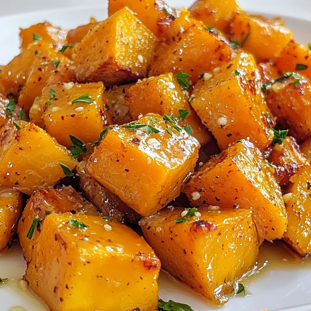 A delightful side dish featuring sweet potatoes roasted with honey and garlic, garnished with fresh parsley.