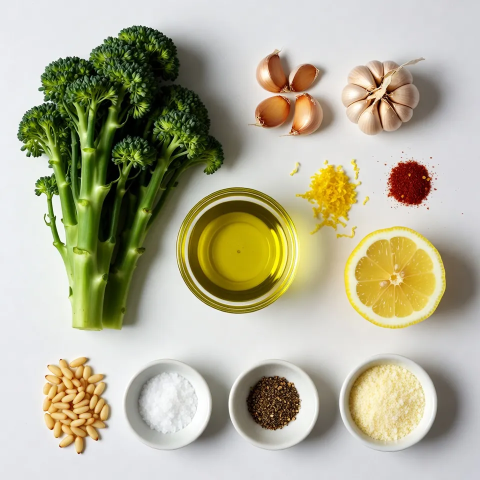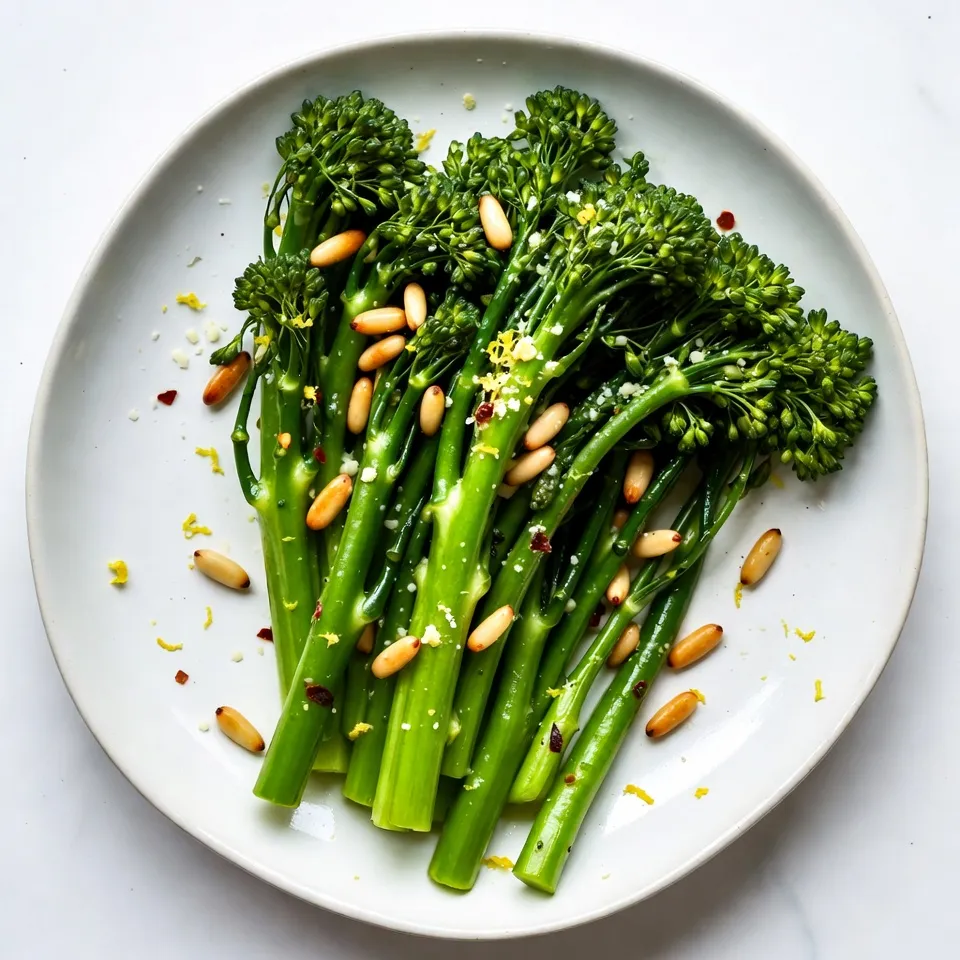 A vibrant and flavorful dish featuring broccolini sautéed with garlic, lemon, and topped with toasted pine nuts.