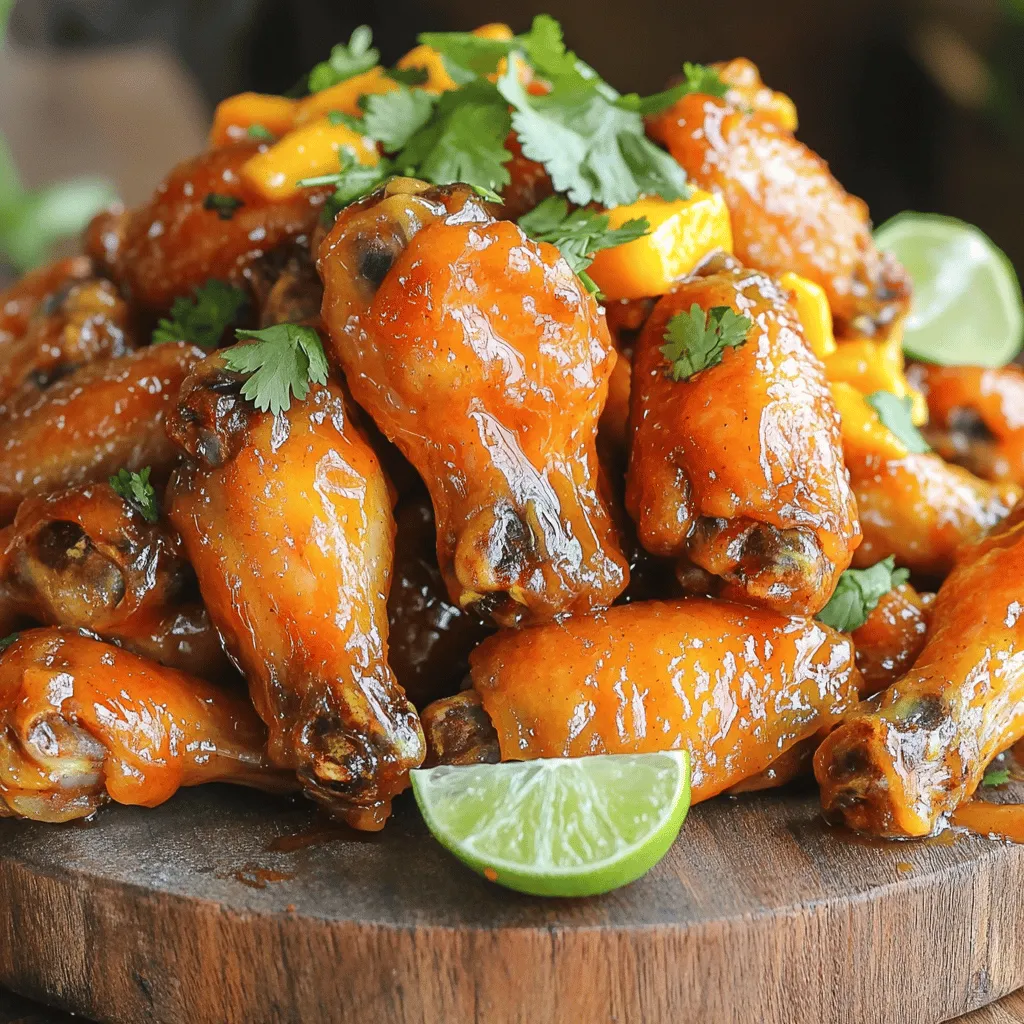 - 2 lbs chicken wings - 1 ripe mango, peeled and diced - 2 fresh habanero peppers, deseeded and finely minced - 2 tablespoons honey - 1 tablespoon soy sauce - 2 tablespoons fresh lime juice - 1 teaspoon smoked paprika - 1 teaspoon garlic powder - 1 teaspoon onion powder - Salt and freshly cracked black pepper to taste - Fresh cilantro, chopped (for garnish) When I make Mango Habanero Chicken Wings, I focus on fresh ingredients. The chicken wings form the base for our dish. I love using 2 lbs of chicken wings. They hold onto flavors well. Next comes the star of the show: a ripe mango. I peel and dice it. The sweet mango balances the heat from the habaneros. I choose 2 fresh habanero peppers. I deseed them and mince them finely. This gives a strong kick to the dish. To make a great marinade, I blend the mango, habaneros, honey, soy sauce, and lime juice. The honey adds sweetness, while lime juice brings brightness. I add smoked paprika, garlic powder, and onion powder for depth. I finish with salt and freshly cracked black pepper. These simple seasonings enhance the wings' flavor. Lastly, I chop fresh cilantro for garnish. It adds a pop of color and fresh taste. - Blend the mango, habaneros, honey, soy sauce, lime juice, smoked paprika, garlic powder, onion powder, salt, and black pepper until smooth. - This creates a vibrant and tasty marinade that brings a tropical flair. - Place the chicken wings in a large bowl or zip-top bag. - Pour half of the marinade over the wings, making sure they are well-coated. - Reserve the rest of the marinade for glazing. - Cover the bowl or seal the bag, and refrigerate for at least one hour. For best flavor, marinate overnight. - Preheat your oven to 400°F (200°C) to get it hot. - Line a baking sheet with parchment paper or foil for easy cleanup. - Arrange the marinated chicken wings in a single layer on the sheet. - Bake for 30-35 minutes, flipping them halfway through to get them crispy. - In the last five minutes of baking, take the wings out and brush them with the reserved sauce. - This step adds a sticky glaze that enhances flavor and texture. - Return the wings to the oven to finish baking. Marinating your chicken wings is key to great flavor. I recommend marinating them for at least 1 hour. For the best taste, try to leave them overnight. This allows all the flavors to soak in deeply. If you want to change up the sweetness, use maple syrup or agave nectar instead of honey. Both options add a unique twist to the marinade. Getting crispy wings involves more than just cooking them. Preheat your oven to 400°F (200°C) for the best results. This high heat helps the wings crisp up nicely. Don't forget to flip the wings halfway through baking. This ensures that both sides become golden and crunchy. When it comes to side dishes, think of cooling options. Serve your wings with ranch or blue cheese dressing. These dips balance the heat well. You can also pair them with fresh veggies like celery and carrots. For a beautiful presentation, use a large platter. Add lime wedges and cilantro to make it pop. This not only looks great but also enhances the flavor. {{image_4}} You can adjust the spice in your Mango Habanero Chicken Wings using different peppers. Habaneros pack a punch, but you can use jalapeños for a milder heat. If you want even less spice, try sweet bell peppers. They add flavor without the heat. To make a milder version, reduce the number of habaneros. You can also mix in some diced mango to balance the heat. This way, you still enjoy the fruity flavor without burning your tongue. You can cook these wings in different ways. Air frying gives them a crispy texture with less oil. Preheat your air fryer to 380°F (193°C). Cook the wings for about 25 minutes, flipping halfway. Grilling is another great option. Preheat your grill to medium-high heat. Cook the wings for about 20 minutes, turning them often. This adds a smoky flavor that pairs well with the mango. If you prefer stovetop cooking, you can sauté the wings. Heat oil in a large skillet over medium heat. Cook the wings for about 15-20 minutes, turning them often until they are golden brown. You can make your wings even better by adding herbs or spices to the marinade. Fresh cilantro or parsley can brighten the flavor. You can also add a pinch of cumin for a warm, earthy taste. Incorporating fruit variations can create unique flavors. Try using pineapple instead of mango for a tropical twist. You can also mix in some orange juice for a citrus kick. Each fruit brings a new layer of taste that keeps things exciting. To store your wings in the fridge, first, let them cool down. Place the wings in an airtight container. This keeps them fresh for later. You can also wrap them tightly in plastic wrap. Make sure the wings are not stacked too high to avoid sogginess. If you want to keep the wings longer, freezing is a great option. Lay the wings on a baking sheet in a single layer. Freeze them for about an hour. This prevents them from sticking together. After they are frozen, place them in freezer bags. Remove as much air as possible before sealing. When it's time to enjoy your leftovers, reheating properly is key. The best way to reheat wings is in the oven. Preheat your oven to 375°F (190°C). Place the wings on a baking sheet and cover them with foil. Bake for about 15-20 minutes. This helps them heat evenly. To keep the wings crispy, remove the foil for the last 5 minutes. You can also use an air fryer. Set it to 350°F (175°C) and heat for 5-7 minutes. This method gives you that crispy finish. Leftover chicken wings can last in the fridge for about 3-4 days. Make sure to check them for any signs of spoilage. If they smell off or look discolored, toss them out. In the freezer, wings can last up to 3 months. After that, they may lose flavor and texture. Always label your bags with the date. This helps you keep track of how long they have been stored. Mango Habanero Chicken Wings pack a punc