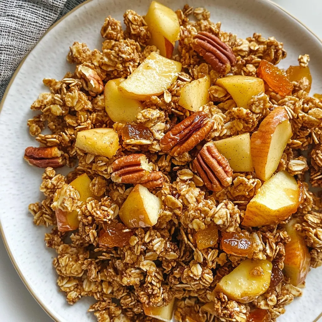 A delicious and crunchy granola made with rolled oats, pecans, dried apples, and sweetened with maple syrup.