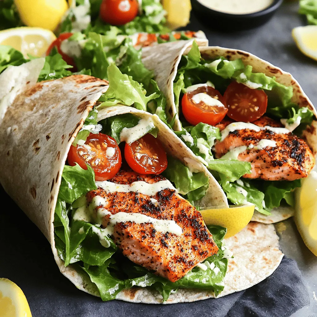 - 2 salmon fillets (approximately 6 oz each) - 2 tablespoons Cajun seasoning - 1 tablespoon extra virgin olive oil - 4 large whole wheat tortillas or spinach tortillas - 2 cups romaine lettuce, chopped into bite-sized pieces - ½ cup Caesar dressing - ¼ cup freshly grated Parmesan cheese - ½ cup cherry tomatoes, halved - Lemon wedges, for serving Gathering fresh ingredients is key. Start with salmon fillets. They should be firm and bright in color. Look for ones with clear eyes and a fresh smell. Next, choose Cajun seasoning. This mix gives the salmon a bold, spicy taste. You can buy it or make your own. Just mix paprika, garlic powder, and black pepper. For the oil, use extra virgin olive oil. This oil is great for cooking and adds healthy fats. Now, grab your wraps. Whole wheat or spinach tortillas work well. These options offer fiber and nutrients. You will also need fresh romaine lettuce. This adds crunch and freshness to your wrap. Caesar dressing is a must. You can buy it or make your own. Homemade options are fun and tasty. For extra flavor, consider optional add-ons. Freshly grated Parmesan cheese adds a savory touch. Cherry tomatoes provide sweetness and color. Lemon wedges give a bright, zesty kick. With these ingredients, you're on your way to making a tasty and healthy dish! Start by drying the salmon fillets. Use paper towels to pat them dry. This step helps get a nice crisp. Next, apply the Cajun seasoning. Rub it generously over both sides of the fillets. Make sure each piece is well-coated for full flavor. Now, heat your skillet. Use medium-high heat and add the olive oil. Wait until the oil shimmers. Carefully place the seasoned fillets in the skillet. Cook them for about 3-4 minutes on each side. The salmon should be fully cooked and have a blackened look. Once done, take the skillet off the heat. Let the salmon rest for a minute before flaking it into bite-sized pieces. On a clean surface, lay out the tortillas. Spread Caesar dressing evenly on each tortilla. Cover most of the surface to ensure good flavor. Now it’s time to layer the ingredients. Start with a handful of chopped romaine lettuce. Add the flaked blackened salmon pieces next. Then, sprinkle on the halved cherry tomatoes. Finish with freshly grated Parmesan cheese. Carefully roll each tortilla from one end, tucking in the sides. Make sure to create a secure wrap. This keeps all the delicious fillings inside. To get the best blackened salmon, start by drying the fillets. Use paper towels to remove excess moisture. This step helps create a nice sear. Next, apply Cajun seasoning evenly. Use about two tablespoons for both fillets. Don’t rush this step; a good coat of seasoning makes the flavor pop. When cooking, heat the olive oil in the skillet until it shimmers. This shows it’s ready. Carefully place the fillets in the pan. Cook for 3-4 minutes on each side. You want a dark, crisp crust. To roll your wraps securely, lay out the tortilla flat. Spread Caesar dressing over most of the surface. This adds flavor and keeps fillings in place. Layer your ingredients wisely. Start with chopped romaine lettuce, then add blackened salmon. Follow with halved cherry tomatoes. Finish with grated Parmesan cheese. This order helps balance flavors and textures. When rolling, tuck in the sides as you go. This keeps all the tasty stuff inside. Make sure to roll tightly but not too tight. For sides, pair the wraps with a fresh salad or sweet potato fries. Both complement the flavors of the wraps well. For a nice presentation, slice each wrap in half diagonally. This shows off the colorful filling. Add lemon wedges on the side for a zesty touch. Squeezing lemon over the wrap brightens every bite. {{image_4}} Want to change up the fish? Try using tilapia or cod. Both are mild and easy to cook. For a fun twist, use shrimp. They grill nicely and add a nice bite. Looking for new toppings? You can add sliced avocado or diced bell peppers. Both add creaminess and color. You might also try red onions for a bit of zing. If you need gluten-free options, use corn tortillas. They are tasty and hold the fillings well. You can also find gluten-free wraps at most stores. Want to make this vegan? Use chickpeas or tofu instead of salmon. For the dressing, swap regular Caesar for a vegan version. You can make it with tahini or cashew cream. To boost flavor, add spices like smoked paprika or garlic powder. They can add depth without much effort. Fresh herbs like cilantro or basil also bring a bright taste. For dressings, try a yogurt-based ranch or a spicy sriracha sauce. Both can add a unique twist to your wraps. Get creative and mix flavors that excite your taste buds! To store your wraps in the fridge, wrap them tightly in plastic wrap or foil. This keeps them fresh and prevents them from drying out. Place the wrapped wraps in an airtight container for extra protection. Always store them in the fridge within two hours of making them. If you want to save the wraps for later, you can freeze them. Wrap each wrap in plastic wrap, then place them in a freezer-safe bag. This method helps prevent freezer burn. When you’re ready to eat, thaw them in the fridge overnight. To reheat, use a microwave for about 1-2 minutes or warm them in a skillet over medium heat until heated through. Assembled wraps can last in the fridge for about 2-3 days. Always check for freshness before eating. Signs of spoilage include a sour smell or slimy texture. If you notice any of these signs, it’s best to discard them. To make salmon wraps healthier, consider these tips: - Use low-calorie tortillas, such as corn or lettuce wraps. - Swap Caesar dressing for a lighter yogurt-based sauce. - Add more veggies like cucumbers or bell peppers for crunch. - Choose fresh herbs instead of cheese for flavor without extra calories. These small changes can keep your wraps tasty and lower in calories. Yes, you can use canned salmon in this recipe. Here are the pros and cons: -