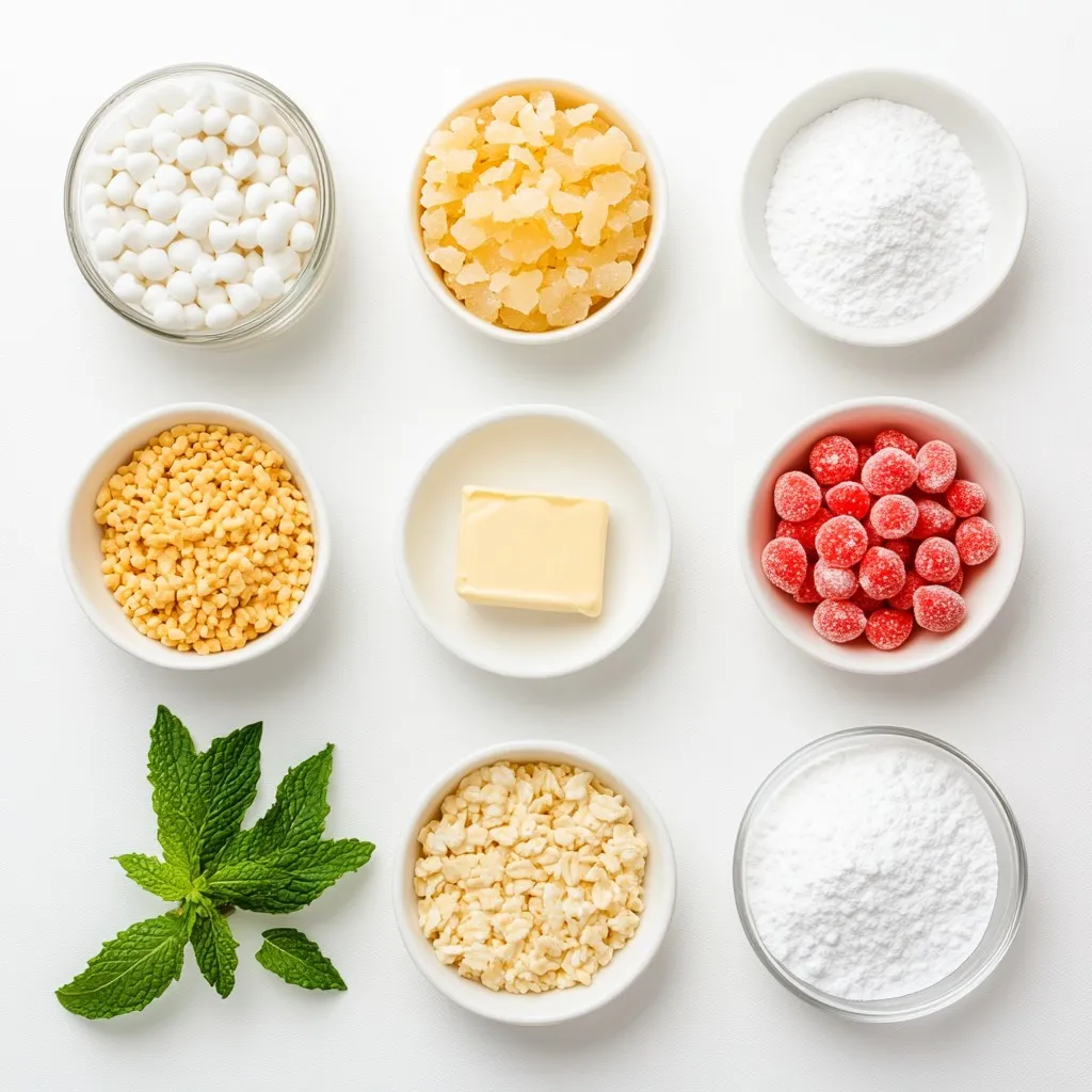 The main ingredients make this treat special. Rice cereal gives it a nice crunch. White chocolate and peanut butter blend to form a creamy mix. The butter helps it melt smoothly. Peppermint extract adds a festive touch. Powdered sugar coats it for sweetness. Crushed peppermint candies provide extra flavor and crunch.