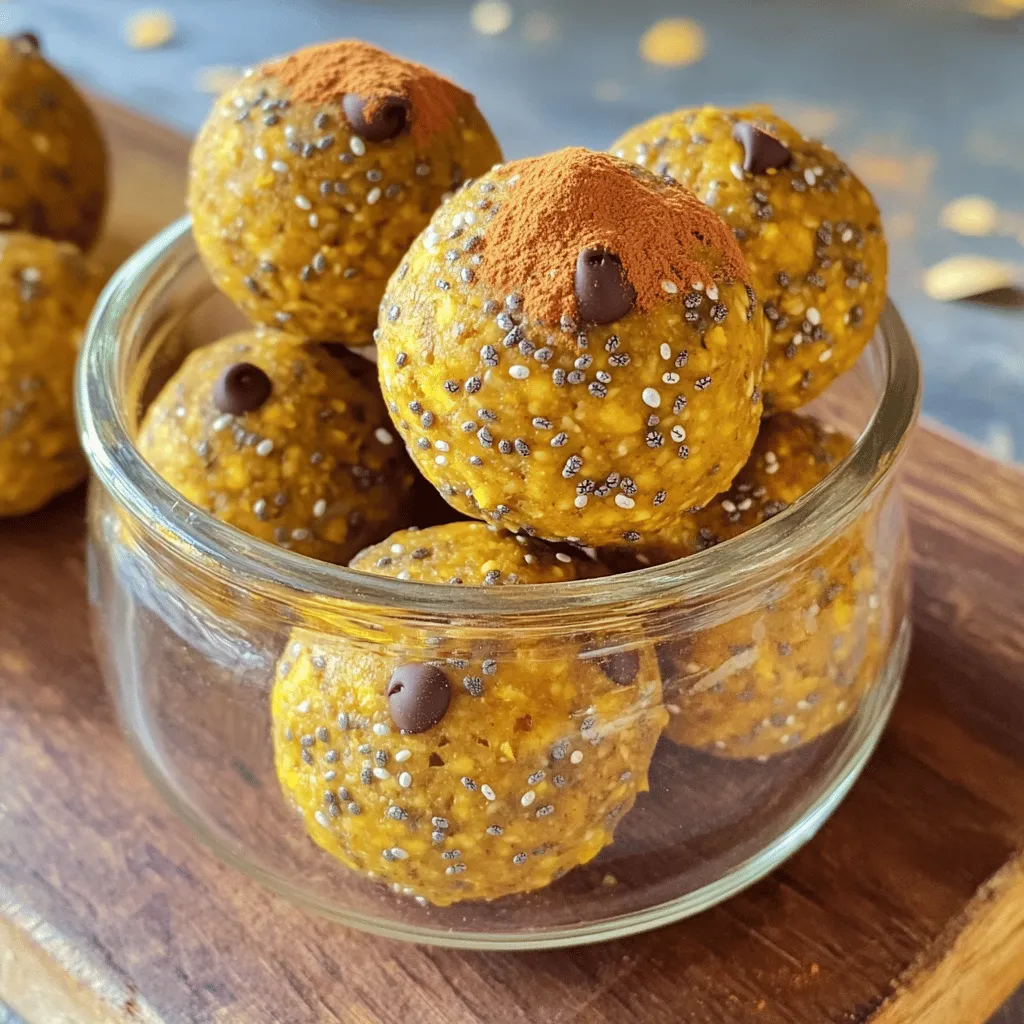 ![- 1 cup rolled oats - 1/2 cup almond butter (or substitute with peanut butter) - 1/2 cup canned pumpkin puree - 1/4 cup honey or maple syrup - 1/2 teaspoon vanilla extract - 1 teaspoon pumpkin spice blend - 1/4 cup chia seeds - 1/4 cup mini chocolate chips (optional) - A pinch of salt These ingredients come together to create a tasty and nutritious snack. Each one plays a key role in flavor and texture. Rolled oats give a hearty base, making the energy balls filling. They provide fiber and energy. Almond butter adds creaminess and healthy fats. You can swap it with peanut butter if you prefer. Canned pumpkin puree brings warmth and a hint of sweetness. It's packed with vitamins and minerals too. Using honey or maple syrup adds natural sweetness. Choose based on your taste. Vanilla extract enhances the overall flavor. The pumpkin spice blend gives that cozy seasonal taste. You can even make your own mix of cinnamon, nutmeg, and ginger! Chia seeds add crunch and omega-3 fatty acids. The mini chocolate chips are optional but bring a fun twist. Finally, a pinch of salt balances all the flavors. To create these delicious Pumpkin Spice Energy Balls, follow the [Full Recipe]. Enjoy making this easy, nutritious snack! 1. In a large bowl, start with rolled oats, almond butter, and pumpkin puree. 2. Add honey or maple syrup for sweetness. 3. Mix these ingredients well until the mixture is thick and sticky. 4. Make sure there are no dry oats left. 5. Next, stir in the vanilla extract and pumpkin spice blend. 6. Add chia seeds and a pinch of salt. 7. For a sweet touch, fold in mini chocolate chips if you like. 1. Take about a tablespoon of the mixture. 2. Roll it between your palms to form a ball. 3. Repeat until you shape all the mixture into about 15 energy balls. 4. For a nice touch, arrange the balls in a clear jar. 5. Sprinkle some pumpkin spice on top for extra flair. 1. Line a baking sheet with parchment paper. 2. Place the energy balls in a single layer on the sheet. 3. Chill them in the fridge for about 30 minutes. This helps them firm up. 4. Once they are set, move the energy balls to an airtight container. 5. Store them in the fridge for up to a week. 6. For longer storage, freeze them individually. Enjoy them as a quick snack later! You can find the full recipe for these tasty and nutritious snacks above. To get the right consistency for your energy balls, aim for a thick and sticky mix. If the mixture is too dry, add a bit more almond butter or pumpkin puree. Make sure there are no dry oats left. You want each bite to be soft and chewy. When it comes to sweetness, adjust to your taste. If you like it sweeter, add more honey or maple syrup. Start with the amount in the recipe and taste as you go. This way, you can find your perfect balance. You can change up the flavor with different nut butters. Try peanut butter for a stronger taste or cashew butter for a creamier texture. You can also mix in spices, like extra cinnamon or a dash of nutmeg, to make them your own. For extra texture, consider adding in nuts or dried fruits. Chopped walnuts or almonds add a nice crunch. Dried cranberries or raisins can give a burst of sweetness. This makes each energy ball unique and exciting. To serve your energy balls, try placing them in a clear glass jar. This shows off their lovely colors. You can also arrange them on a rustic wooden board for a homey feel. For special occasions, sprinkle some pumpkin spice on top. This adds a festive touch. You can even use mini cupcake liners to make them look like treats. Small details can make your energy balls stand out and be more fun to eat. {{image_4}} You can mix up your pumpkin spice energy balls with fun flavors. One great option is chocolate chip pumpkin spice energy balls. Just fold in some mini chocolate chips when you mix your ingredients. This adds a sweet touch that pairs well with the spice. Another tasty choice is spiced apple energy balls. For this, swap the pumpkin puree with applesauce and add a pinch of cinnamon. This brings a fresh twist to your snack while keeping it healthy. If you have dietary needs, don't worry! You can make gluten-free options easily. Use gluten-free oats instead of regular rolled oats. This small change keeps the energy balls safe for your gluten-sensitive friends. For nut-free alternatives, use sunflower seed butter in place of almond butter. This keeps the creamy texture while making it safe for those with nut allergies. Always check labels to ensure your ingredients fit your needs. You can also add seasonal flavors to your energy balls. For a holiday touch, consider adding dried cranberries and chopped pecans. These ingredients bring a festive flavor, making your energy balls perfect for gatherings. Just mix them in when you combine your other ingredients. To keep your pumpkin spice energy balls fresh, use an airtight container. Glass jars or plastic containers with secure lids work well. This helps prevent any air or moisture from getting in. In the refrigerator, these energy balls last up to a week. They taste best when cold and firm. For long-term storage, you can freeze your energy balls. Lay them in a single layer on a baking sheet. Place the sheet in the freezer for about an hour. This makes them firm. Once frozen, transfer them to a freezer-safe bag. Remove as much air as you can. These energy balls can last for up to three months in the freezer. When you want to eat one, simply take it out and let it sit at room temperature for about 15 minutes. You can also microwave it for about 10 seconds if you prefer a warm snack. Each energy ball is about one tablespoon. This is a great size for a quick snack. I usually recommend having two or three energy balls at a time. That keeps your energy up without overdoing it. Each energy ball has around 100 calories. They are packed with nutrients! You get fiber from the oats and chia seeds, protein from the almond butter, and vitamins from the pumpkin. Enjoy these tasty bit