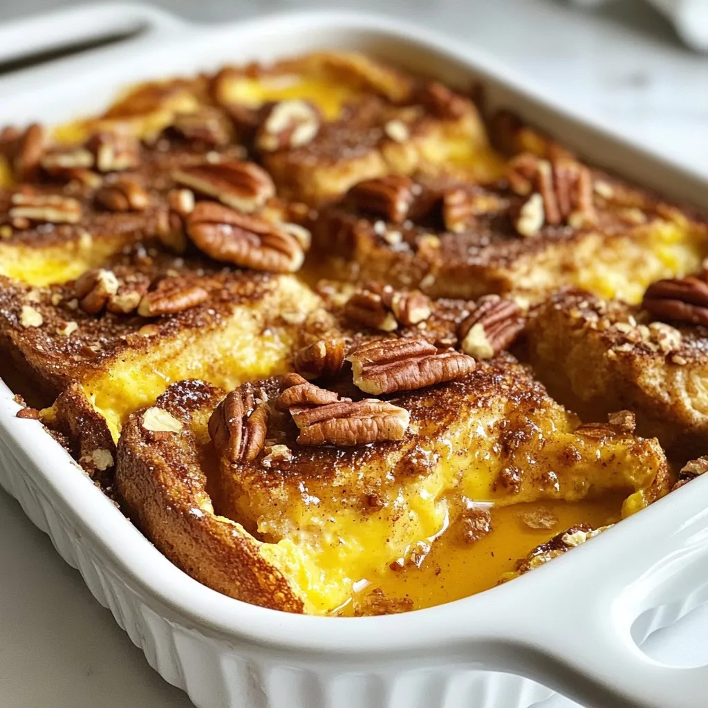 A delicious and comforting baked French toast dish infused with pumpkin spice flavors, perfect for breakfast or brunch.