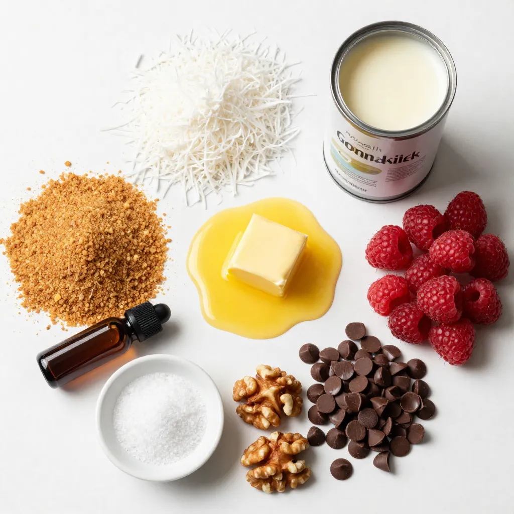 Next, you’ll need unsweetened shredded coconut. This adds a tropical flavor that pairs well with the raspberries. Melt your unsalted butter to bind everything together. Sweetened condensed milk is key for that rich, creamy layer.