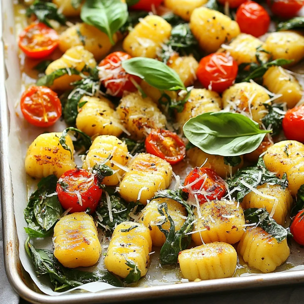To make a tasty sheet pan garlic butter gnocchi, you'll need the following ingredients: - 1 pound gnocchi (store-bought or homemade) - 4 tablespoons unsalted butter - 5 cloves garlic, finely minced - 1 cup cherry tomatoes, halved - 1 cup fresh spinach, roughly chopped - 1 teaspoon dried Italian herbs (a mix of oregano, basil, and thyme) - Salt and freshly ground black pepper to taste - Freshly grated Parmesan cheese for serving - Fresh basil leaves for garnish Each ingredient plays a key role in creating that rich flavor. The gnocchi serves as a soft and chewy base. Garlic brings a bold taste, while butter adds creaminess. Cherry tomatoes provide sweetness, and spinach adds color and nutrition. The Italian herbs give your dish a warm aroma. Salt and pepper balance everything out. Finally, Parmesan cheese adds a salty kick, and fresh basil gives a fragrant finish. Make sure to gather these items before you start cooking. Enjoy the process of preparing this delightful meal! {{ingredient_image_2}} First, set your oven to 425°F (220°C). This high heat helps the gnocchi turn golden and crispy. Line a large sheet pan with parchment paper. This makes for easy cleanup and helps cook evenly. Next, grab a small saucepan. Melt 4 tablespoons of unsalted butter over medium heat. Once the butter melts, add 5 cloves of finely minced garlic. Sauté the garlic for 1-2 minutes. You want it fragrant but not burnt. Once done, remove it from heat and set it aside. Now, take your prepared sheet pan. Spread 1 pound of gnocchi evenly across it. Add 1 cup of halved cherry tomatoes and 1 cup of roughly chopped fresh spinach. Make sure everything has space. This helps each piece cook well. Drizzle the garlic butter over the gnocchi and veggies. Toss everything gently using your hands or a spatula. Make sure every piece is coated in that rich butter. Sprinkle 1 teaspoon of dried Italian herbs, salt, and freshly ground black pepper on top. Spread the ingredients into an even layer. Place the sheet pan in the oven. Bake for about 20 minutes. The gnocchi should be golden, and the tomatoes will blister. After baking, stir the dish gently to mix the flavors. Let it cool for a minute before serving. Top with freshly grated Parmesan cheese and garnish with fresh basil leaves. Enjoy it hot for the best taste! For the best gnocchi, start with fresh, high-quality ingredients. Use store-bought gnocchi for ease or make your own for a fun twist. When cooking, boil gnocchi in salted water until they float. This means they are done. After boiling, dry them off gently to help them crisp up in the oven. When you bake them, space them out well on the sheet pan. This helps them become golden and crispy. Toss them with the garlic butter evenly, ensuring each piece gets coated. This step is key for flavor. If you want to switch things up, try using olive oil instead of butter. Olive oil gives a nice, rich flavor and is a bit lighter. You can also use garlic-infused oil for extra garlic taste without the bits. For a vegan option, try a plant-based butter. It works well and keeps the dish creamy. For added flavor, mix in herbs like rosemary or thyme into your butter or oil. You can also use crushed red pepper for a bit of spice! Garnishing adds a nice touch to your dish. Fresh basil leaves bring a bright flavor that really lifts the dish. For a bit of zest, sprinkle some lemon zest on top right before serving. It adds freshness. Don't forget the Parmesan cheese! Freshly grated cheese is best. It melts beautifully and gives a savory finish. For an extra touch, drizzle a little more melted butter on top just before serving for that rich, buttery experience. Pro Tips Use Fresh Ingredients: Fresh spinach and ripe cherry tomatoes will enhance the flavor and texture of your dish, making it more vibrant and delicious. Customize Your Herbs: Feel free to experiment with fresh herbs like basil or parsley instead of dried Italian herbs for a more pronounced flavor profile. Perfecting Gnocchi Texture: For extra crispy gnocchi, consider pan-frying them briefly in the butter before baking to achieve a delightful golden crust. Serving Suggestions: Pair this dish with a light salad or crusty bread to create a well-rounded meal that balances flavors and textures. {{image_4}} You can add many vegetables to your sheet pan meal. Try bell peppers for sweetness. Zucchini adds a nice crunch. Broccoli is also a great choice. Just chop them up and mix them in. You want to keep the cooking time in mind. Cut vegetables thinly to cook well in the oven. This way, you get a colorful and tasty dish. Adding protein makes this dish even heartier. Cooked chicken or sausage pairs well with gnocchi. Shrimp is another tasty option. Just toss it in with the other ingredients. If you want a meat-free option, try chickpeas. They add flavor and nutrition. Make sure to adjust cooking times if you use raw meat. If you need a gluten-free option, look for gluten-free gnocchi. Many brands offer this now. You can also make your own with gluten-free flour. Just follow the same steps for cooking. You won’t miss out on taste or texture. This dish can easily fit into a gluten-free diet. Enjoy every bite without worry! After you enjoy your meal, store the leftovers in an airtight container. Let the dish cool completely before sealing it up. This helps keep the gnocchi fresh. Place the container in the fridge. It will stay good for about three days. To reheat, you can use the oven or a microwave. If using the oven, preheat it to 350°F (175°C). Spread the gnocchi on a baking sheet and heat for about 10 minutes. This helps keep them crispy. For the microwave, heat in 30-second bursts until warm. Stir between heating to get even warmth. To freeze, let the dish cool completely. Place it in a freezer-safe container. You can also use freezer bags. Make sure to remove as much air as possible. Label the bag with the date. It can stay in the freezer for about two months. When ready to eat, th