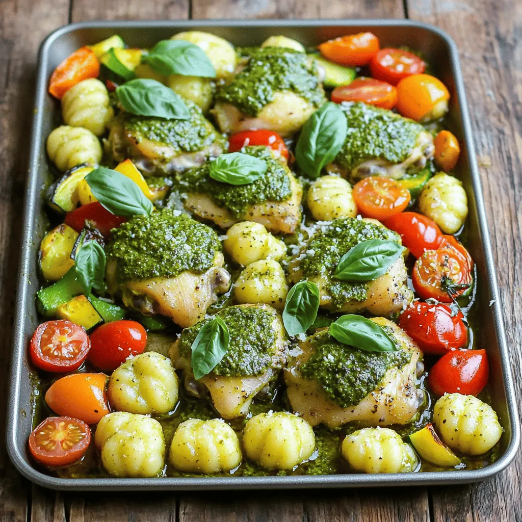 For a rustic presentation, serve straight from the sheet pan. This keeps it casual and fun. If you want something more elegant, plate the food individually. Add a drizzle of extra pesto for a pop of color. Fresh basil leaves make a lovely garnish too. They add both flavor and beauty to your meal.