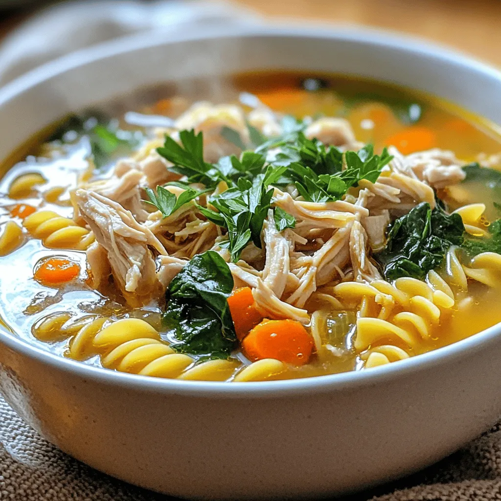 After cooking, use tongs to take the chicken thighs out. Place them on a cutting board. Shred the chicken using two forks until it’s in small pieces. Return the shredded chicken to the slow cooker. Now, add 1 cup of egg noodles and 2 cups of fresh spinach leaves. Stir everything together well. Cover the pot again. Cook on high for another 15-20 minutes until the noodles are soft. Taste the soup, and add more salt or pepper if needed. Finally, serve hot with some fresh parsley on top for color and flavor. Enjoy your soup!