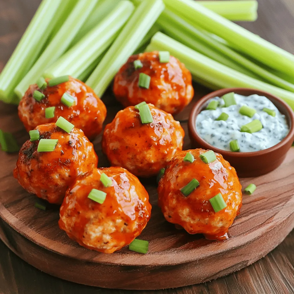- 1 lb ground chicken - 1/2 cup breadcrumbs (preferably seasoned) - 1/4 cup grated Parmesan cheese - 1/4 cup buffalo sauce - 1/4 cup finely chopped green onions (including green tops for color) - 2 cloves garlic, minced (or 1 teaspoon garlic powder) - 1 teaspoon onion powder - Celery sticks - Blue cheese dressing When I make these spicy buffalo chicken meatballs, I start with ground chicken. It’s lean and holds flavor well. I love using seasoned breadcrumbs for added taste and texture. Grated Parmesan cheese gives them a nice, cheesy bite. Buffalo sauce is key to that spicy kick. I always add fresh green onions for a mild onion flavor and a burst of color. Garlic and onion powder deepen the taste, making each meatball flavorful. For serving, I like to include crunchy celery sticks and blue cheese dressing. They cool down the heat and add a crisp texture. These simple ingredients come together to make an irresistible snack! - Preheat the oven to 400°F (200°C). - Line a baking sheet with parchment paper. This helps with cleanup. - Grab a large mixing bowl. - Measure and add the following ingredients: - 1 lb ground chicken - 1/2 cup breadcrumbs - 1/4 cup grated Parmesan cheese - 1/4 cup finely chopped green onions - 1 large egg - 1/4 cup buffalo sauce - 2 cloves garlic, minced - 1 teaspoon onion powder - 1 teaspoon smoked paprika - Salt and pepper to taste - Shape the mixture into meatballs about 1 inch wide. - Place them on the baking sheet, leaving space between each. - Bake the meatballs for 20-25 minutes. - Check they reach an internal temperature of 165°F (74°C). - For extra flavor, brush more buffalo sauce on top in the last 5 minutes of baking. - Let the meatballs cool for a few minutes before serving. To make great meatballs, avoid overmixing. Mix just until the ingredients blend. If you work the meat too much, it gets tough. The ideal meatball size is about 1 inch in diameter. This size ensures even cooking and a juicy bite. If they are too big, they may not cook through. Adding buffalo sauce for glazing is easy. Brush it on during the last five minutes of baking. This step gives your meatballs a shiny look and extra kick. For maximum flavor, glaze right before you take them out of the oven. This timing helps the sauce stick and intensify the taste. The best dips to pair with these meatballs are creamy blue cheese dressing and ranch. These dips cool the spice and add richness. For serving, arrange the meatballs on a platter. Add crunchy celery sticks around them for color and crunch. This not only looks nice but gives a refreshing contrast to the spicy meatballs. {{image_4}} You can cook spicy buffalo chicken meatballs in different ways. - Baked versus fried meatballs: Baking meatballs is healthier. It allows the fat to drip off. Fried meatballs have a crispy outside but use more oil. Baking at 400°F (200°C) gives a nice texture while keeping them juicy. - Cooking in an air fryer: An air fryer is a great option too. It cooks meatballs quickly and evenly. Preheat it to about 375°F (190°C) and cook for 10-12 minutes. You’ll get a crispy outside without much oil. Adjust the heat of your meatballs easily. - Adjusting heat with different buffalo sauces: Buffalo sauce comes in many heat levels. If you like it mild, choose a milder sauce. For more heat, pick a hot sauce or a spicy version. - Adding spices to customize flavor: You can add spices like cayenne pepper or chili powder for extra kick. Mix them in with the other ingredients before shaping the meatballs. Swap ingredients to fit your taste. - Alternatives for ground chicken: You can use ground turkey or even lean beef. These options still work well, but they may change the flavor slightly. - Substituting breadcrumbs: If you don’t have breadcrumbs, you can use crushed crackers or oats. They help hold the meatballs together just like breadcrumbs do. To keep your spicy buffalo chicken meatballs fresh, store them in an airtight container. This helps prevent drying out and keeps flavors intact. Place a piece of parchment paper between the meatballs to avoid sticking. You can safely refrigerate them for up to three days. After that, they may lose flavor and texture. Freezing is a great option for long-term storage. After cooking, let the meatballs cool completely. Then, place them in a single layer on a baking sheet. Freeze until solid, about one hour. Once frozen, transfer the meatballs to a freezer bag. They can last for up to three months. To enjoy them later, thaw in the fridge overnight and reheat in the oven at 350°F (175°C) until hot. Batch cooking saves time on busy days. Make a large batch of meatballs and store them for quick meals. Use glass or BPA-free plastic containers for best results. Label each container with the date for reference. This way, you can enjoy your tasty meatballs whenever you want! Bake the meatballs for 20-25 minutes at 400°F (200°C). This temperature helps them cook evenly. To be sure they are done, check the internal temperature. It should reach 165°F (74°C). This ensures they are safe to eat. Yes, you can use ground turkey in place of chicken. Turkey offers a lighter flavor and lower fat. Just make sure to check the seasoning, as turkey can be less flavorful than chicken. You might want to add a bit more buffalo sauce or spices. You can try various sauces to change the meatball flavor. Here are some fun options: - Barbecue sauce for a smoky taste. - Teriyaki sauce for a sweet twist. - Honey mustard for a tangy kick. Experiment to find your favorite! Spicy Buffalo Chicken Meatballs are a tasty and fun dish. You learned about key ingredients like ground chicken and buffalo sauce. I shared the best steps for mixing, baking, and serving. Tips helped ensure perfect meatballs and added flavor. Lastly, you discovered variations and storage tips for leftovers. Now, you can try different methods and customize these meatballs to your liking. Enjoy making this dish and impress your friends!