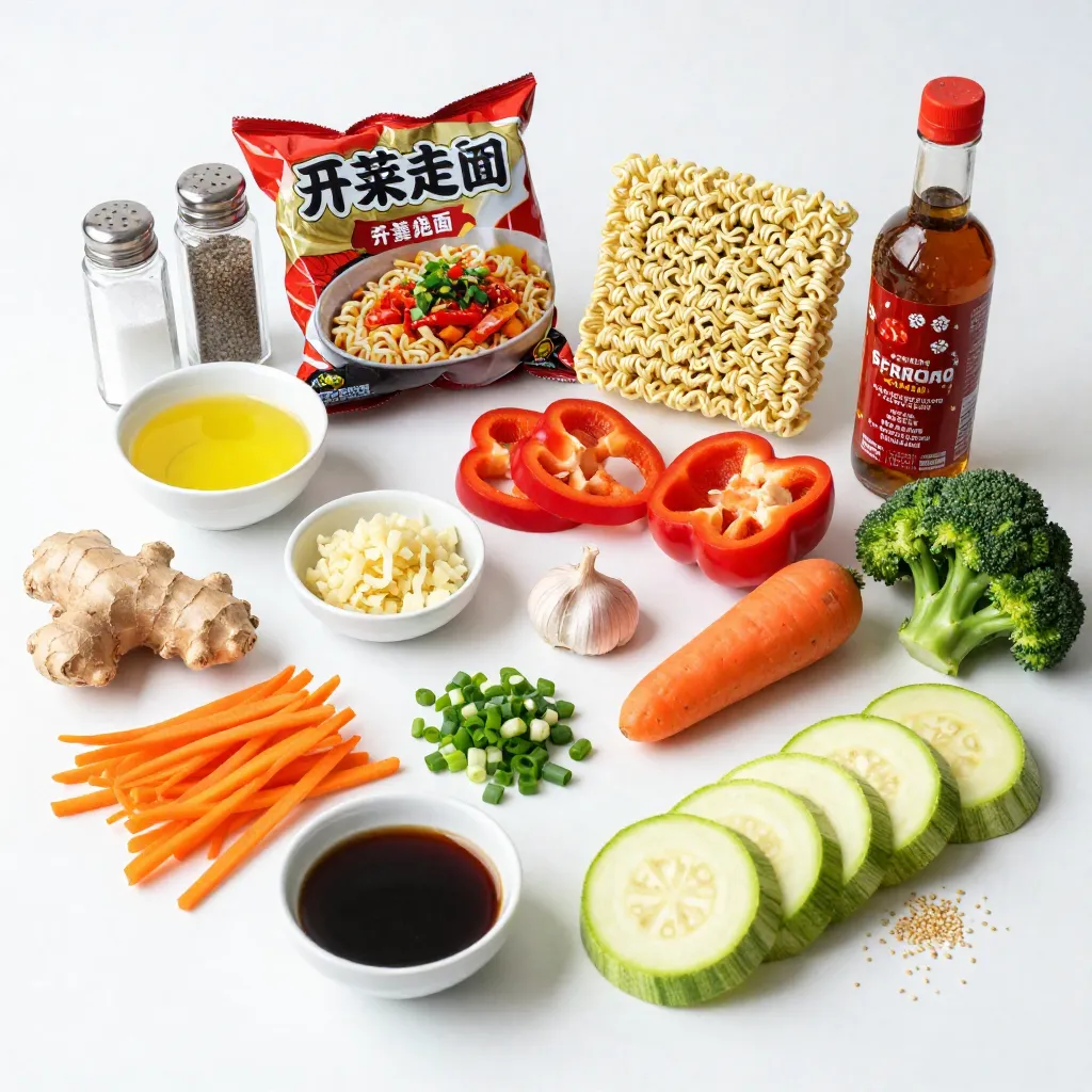 This recipe uses simple, easy-to-find ingredients. Instant ramen noodles serve as the base. Fresh vegetables add color and crunch. Garlic and ginger bring bold flavor. The soy sauce and sriracha add depth and heat. Sesame oil finishes the dish, giving it a nutty aroma.