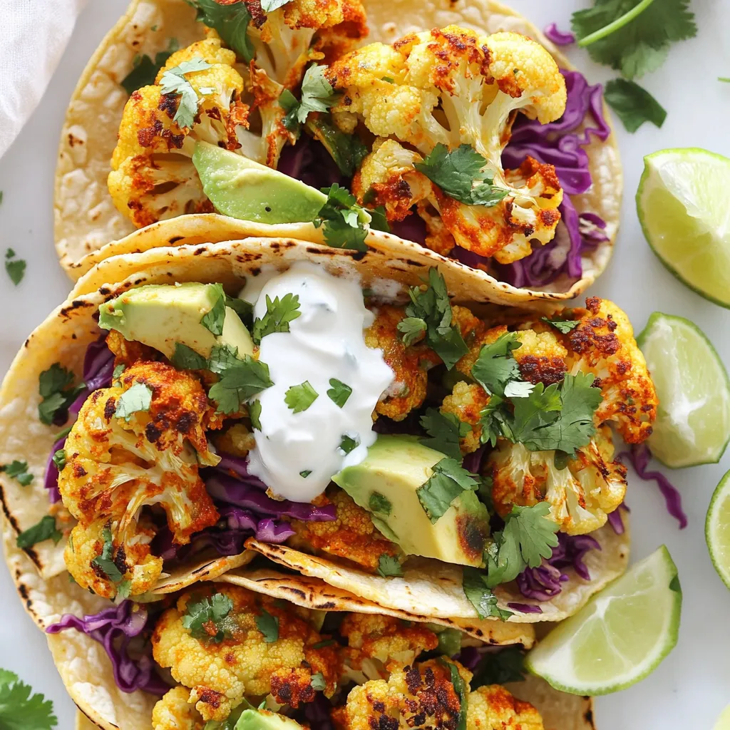 While the cauliflower roasts, warm up 8 small corn tortillas in a skillet over medium heat. Heat each side for around 30 seconds. This makes them soft and easy to fold. Once the cauliflower is ready, grab your warm tortillas. Start by placing a generous spoonful of roasted cauliflower on each tortilla. Next, add some finely shredded red cabbage, creamy avocado slices, and a sprinkle of fresh cilantro. This layering brings balanced flavors. For a creamy touch, consider adding Greek yogurt or a dairy-free option. Serve with lime wedges on the side. Squeezing fresh lime juice over the tacos adds a burst of zest!