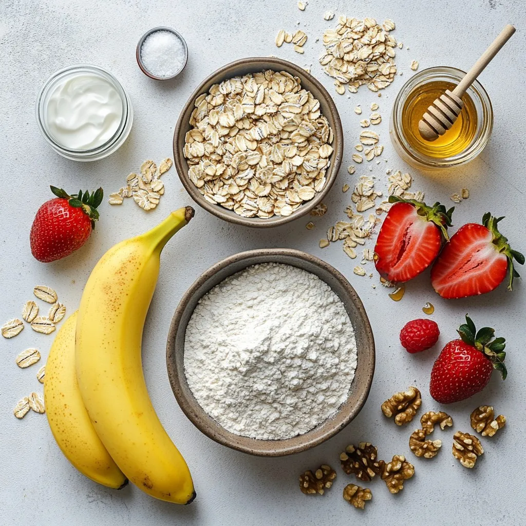 These ingredients create a soft and moist muffin. Each item plays a role. The oats add texture and fiber. Flour gives structure, while brown sugar keeps them sweet and soft. Baking powder and baking soda help them rise. The salt brings out flavors. Ground cinnamon adds warmth. Ripe bananas are key for sweetness and moisture. Yogurt keeps the muffins tender. Eggs bind everything. Honey or maple syrup adds natural sweetness. Vanilla enhances the flavor. Fresh strawberries provide juicy bites. Nuts add crunch and flavor.