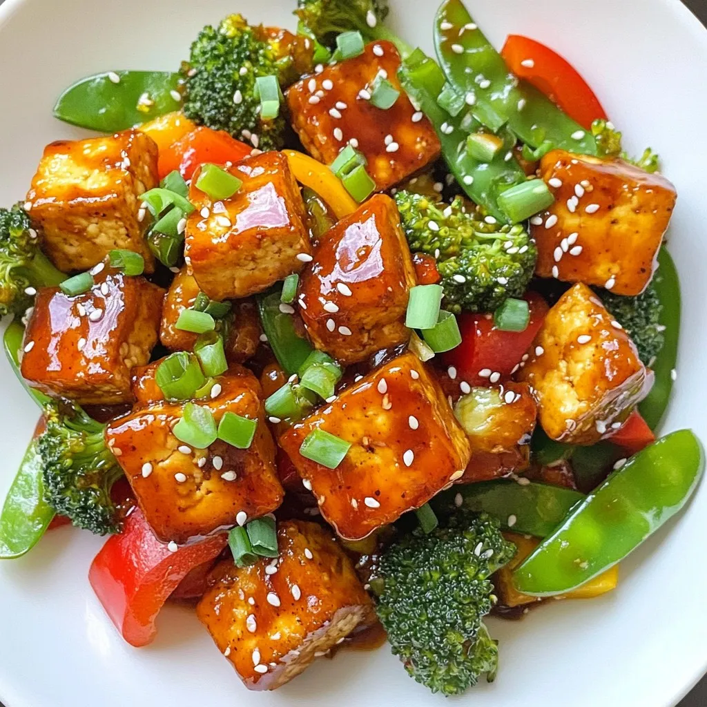 - 14 oz firm tofu, well-pressed and cut into 1-inch cubes - 2 tablespoons cornstarch - 2 tablespoons vegetable oil (plus more if needed) - 1 bell pepper (choose red or yellow for sweetness), sliced - 1 cup broccoli florets (fresh or frozen) - 1 cup snap peas (trimmed) - 3 cloves garlic, minced - 1 tablespoon fresh ginger, minced - 1/4 cup sweet chili sauce - 1 tablespoon soy sauce - 1 tablespoon rice vinegar To create a tasty Sweet Chili Tofu Stir-Fry, you need firm tofu, colorful veggies, and flavorful sauces. Start with firm tofu. Press it well to remove moisture, so it can crisp nicely. Cut it into 1-inch cubes for even cooking. Next, grab some fresh or frozen vegetables. I love using bell peppers, broccoli, and snap peas. They add both crunch and color to the dish. The sauces are key to flavor. Sweet chili sauce gives a nice kick and sweetness. Soy sauce adds saltiness, while rice vinegar adds a tangy note. These three work together to create a rich taste. - Salt and black pepper to taste - 2 green onions, finely chopped (for garnish) - Sesame seeds (for garnish) Now, let’s talk about seasoning. A pinch of salt and black pepper enhances the overall flavor. Don’t forget the garnishes! Chopped green onions add freshness, while sesame seeds give a nice crunch. These small touches elevate the final dish. Use them generously for a beautiful presentation. {{ingredient_image_2}} Start by pressing the tofu. Place it between two plates and add weight on top. Let it sit for about 15 minutes to remove excess moisture. This step is key for crispy tofu. After pressing, cut the tofu into 1-inch cubes. Sprinkle 2 tablespoons of cornstarch over the cubes. Toss gently to coat all sides evenly. In a large skillet, heat 1 tablespoon of vegetable oil over medium-high heat. Wait until the oil is hot, then add the coated tofu cubes to the pan. Fry the tofu for 5-7 minutes, turning occasionally. You want them golden brown and crispy. Once done, carefully remove the tofu and set it aside on a plate. In the same skillet, add more oil if needed. Now, add the sliced bell pepper, broccoli florets, and snap peas. Stir-fry these for about 3-4 minutes. Cook until they are bright and tender but still crisp. This keeps the veggies fresh and full of flavor. Next, introduce the minced garlic and ginger to the skillet. Stir-fry them for one more minute. This step brings out their rich flavors. Be careful not to let them burn, as that can make them bitter. Now, return the crispy tofu to the skillet with the vegetables. Pour in 1/4 cup of sweet chili sauce, 1 tablespoon of soy sauce, and 1 tablespoon of rice vinegar. Use a spatula to toss everything gently. Make sure the tofu and veggies are well coated with the sauce. Season your stir-fry with salt and black pepper to taste. Let it cook for an extra 2 minutes. This allows the sauce to thicken and the flavors to blend. Finally, remove from heat and garnish with chopped green onions and sesame seeds before serving. This adds a nice crunch and extra flavor to your dish. Tofu is great but can be soft if not cooked right. Pressing it is key. When you press tofu, you remove extra water. This makes it firm and helps it crisp up. Press it for about 15 minutes. After pressing, cut the tofu into 1-inch cubes. Next, sprinkle cornstarch over these cubes. Toss them gently to coat each one. This coating creates a crunchy texture when you fry it. For a tasty stir-fry, choose the right vegetables. Bell peppers, broccoli, and snap peas work well. They add color and crunch. Cut them into even pieces for even cooking. Stir-fry these vegetables for 3-4 minutes. You want them to be bright and crisp-tender. Avoid overcooking them, or they will become mushy. You can adjust the sauce to fit your taste. If you want it sweeter, add more sweet chili sauce. For more heat, try adding chili flakes or sriracha. You can also make your own sweet chili sauce. Combine sugar, vinegar, and chili in a pan. Simmer until thick. This way, you get a fresh flavor that fits your dish perfectly. Pro Tips Pressing Tofu: Ensure you press the tofu well to remove excess moisture. This step is crucial for achieving a crispy texture during frying. Vegetable Timing: Add vegetables to the pan based on their cooking times. Start with those that take longer to cook, like broccoli, and add quicker-cooking ones like snap peas later. Adjusting Sauce: Feel free to adjust the amount of sweet chili sauce based on your spice preference. You can add more for a sweeter dish or less for a milder flavor. Garnishing: Don’t skip the garnishing step! Fresh green onions and sesame seeds add a delightful crunch and elevate the presentation of the dish. {{image_4}} You can change the protein in this dish. Tempeh is a great choice. It has a nutty flavor and a firm texture. Seitan is another option. It mimics meat well and absorbs flavors nicely. If you prefer seafood, try shrimp. Shrimp cooks quickly and adds a sweet taste. Chicken is also a classic choice. Cut it into small pieces for even cooking. Feel free to mix up the veggies! You might like carrots or bell peppers for sweetness. Zucchini adds a nice crunch, while mushrooms bring earthiness. Seasonal veggies like asparagus or snap peas are also great. They add freshness and color to your stir-fry. Want more heat? Add chili flakes or a touch of sriracha. This will kick up the spice level. For a different taste, try mixing sauces. You could blend teriyaki with sweet chili sauce for a twist. Soy sauce with a hint of lime adds a zesty flavor. Explore these options to find your perfect balance! Store leftover sweet chili tofu stir-fry in the fridge. Use an airtight container. This helps keep the dish fresh. You can enjoy it for up to three days. If you want to keep it longer, consider freezing. You can reheat your stir-fry on the stovetop or in the microwave. The stovetop method works best for keeping texture. Heat in a pan over medium heat until warm. Stir often to avoid burning. The 
