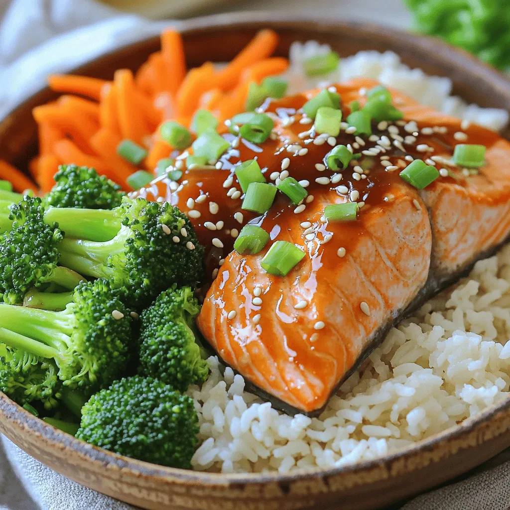 To make teriyaki salmon rice bowls, start by rinsing jasmine rice. Cook it in water or broth until fluffy. While the rice cooks, mix teriyaki sauce, sesame oil, soy sauce, ginger, and garlic in a bowl. Marinate salmon fillets in this mixture for about five minutes. Cook the salmon in a skillet until golden. Steam broccoli and carrots until bright and tender. Finally, scoop rice into bowls, top with salmon, veggies, green onions, and sesame seeds.