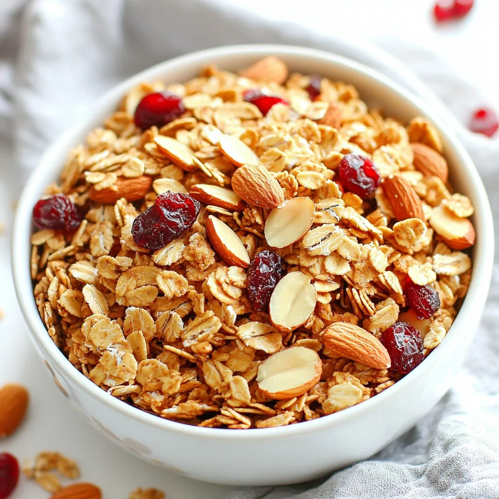 A delicious and crunchy granola made with rolled oats, sliced almonds, and a touch of sweetness from honey or maple syrup.